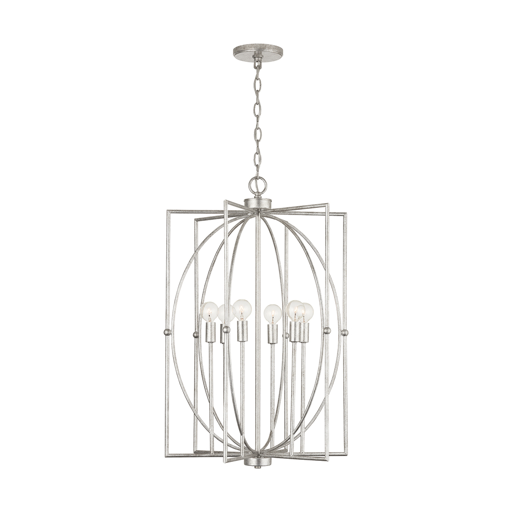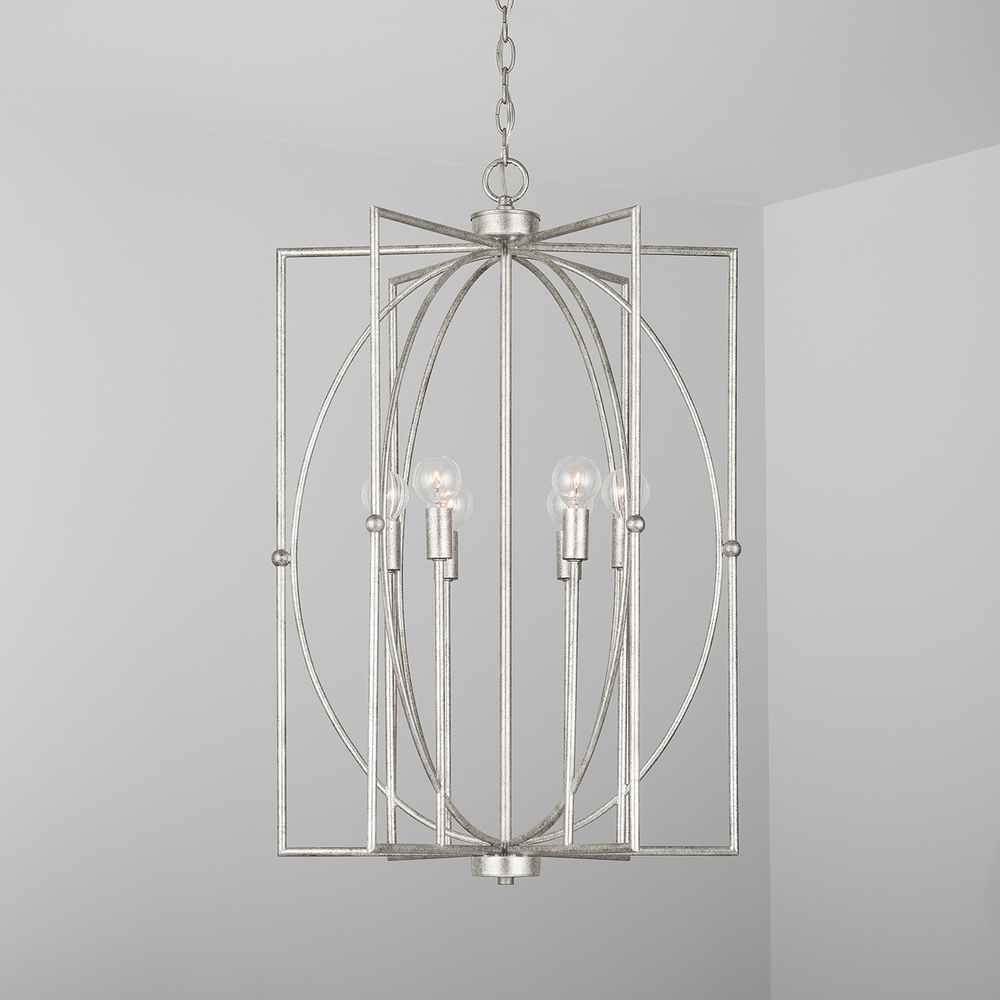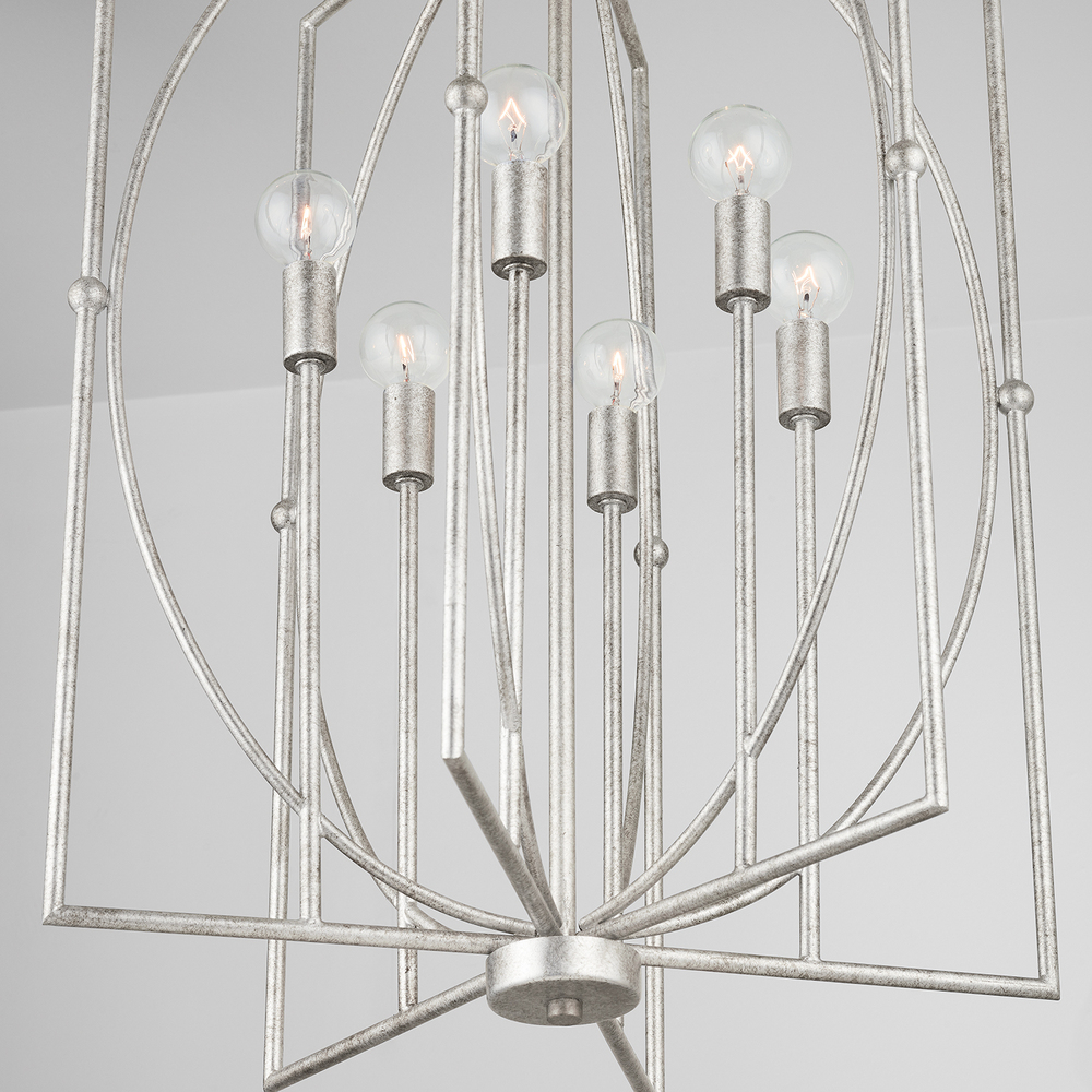 The 6-Light Foyer features prominent ring details, anchored in symmetrical frames. The Antique Silver finsh adds a layer of sophistication to the open, airy style.