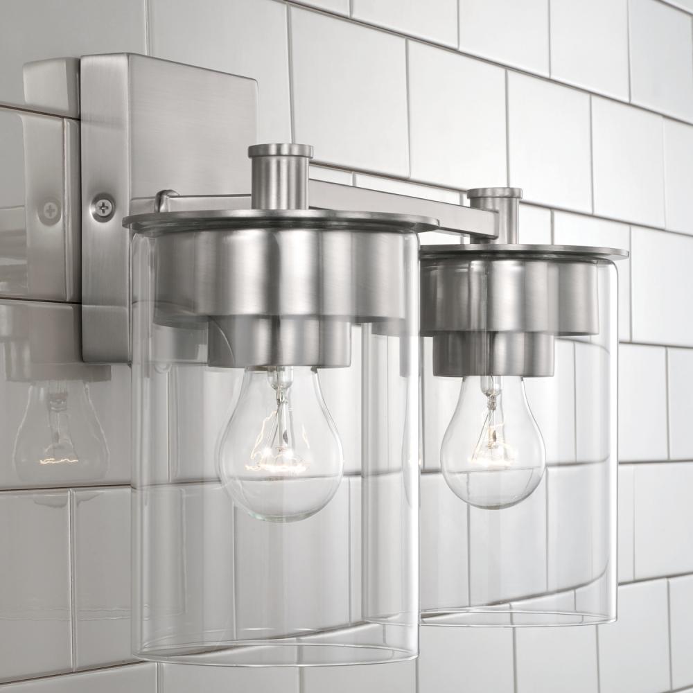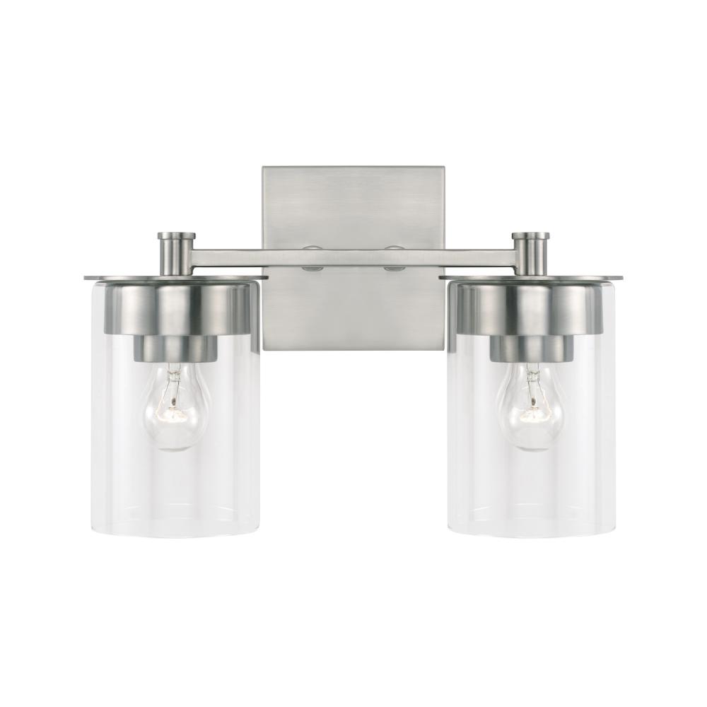 Clean lines and modern forms create the Mason 2-Light Vanity for Homeplace. The Brushed Nickel finish accents the designer details and adds warmth to any bathroom. Also available in a 3-Light or 4-Light.