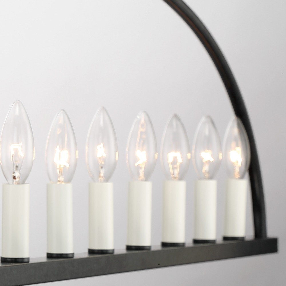The Abbott linear chandelier presents a simple, streamlined shape and clean lines. The open-concept frame features a metal arch and a sleek, narrow rod with a series of thin bulbs. Mounted above an island or over a dining room table, this fixture appeals to a minimalist sense of style and comes with both white and gold candle sleeves. The Abbott comes in vibrant gold and black finish.