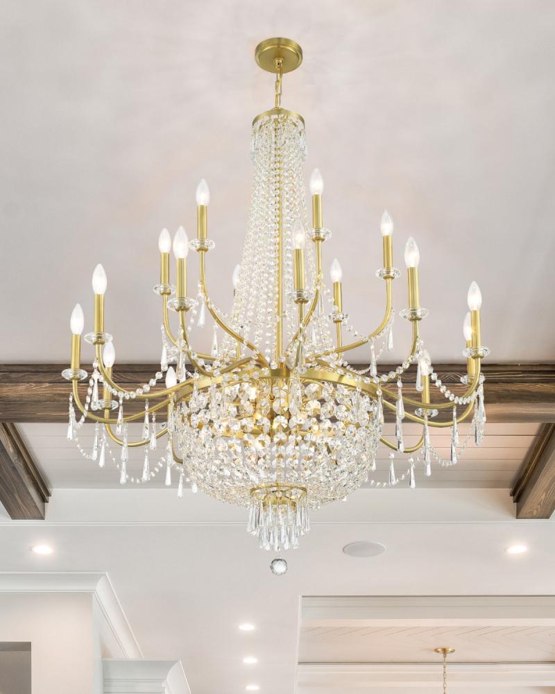 The Haywood is a luminary collection defined by its timeless elegance and classic empire silhouette. This fixture is a radiant centerpiece that adds a touch of luxury to any space. The Haywood's defining feature is its cascading crystal accents, which create a captivating display of light and sparkle. Its upward-sweeping arms, adorned with strands of faceted cut crystal jewels, create an enchanting ambiance. Each decorated with unique charm, the bobeches add a layer of sophistication to this stunning chandelier.