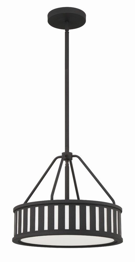 The contemporary Kendal collection makes a statement with its graphic uniform pattern. Its metal frame surrounds white glass in this elegant drum-shaped pendant. The high contrast of Vibrant Gold, Black Forged, or Polished Nickel against white glass is a great way to add a touch of drama to a room.