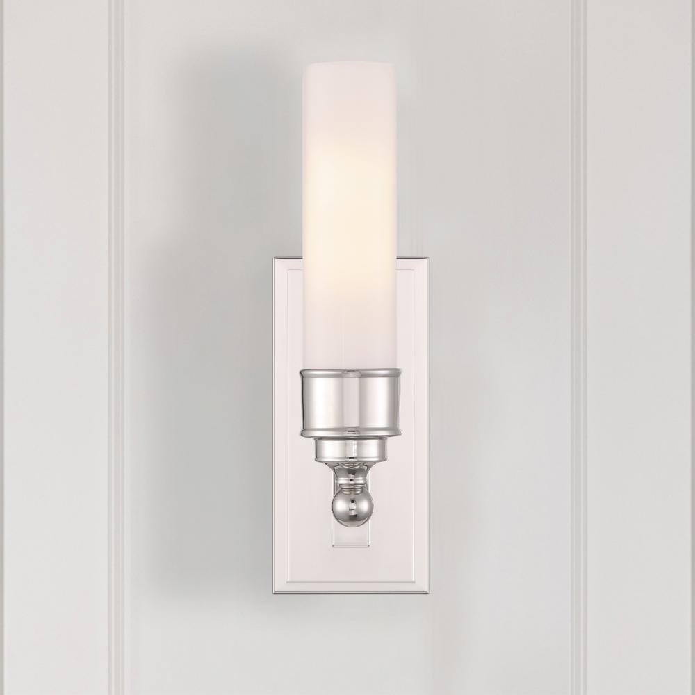 The Wilcox collection includes a white cylindrical glass shade and a rectangular back plate with stepped detailing. It is damp-listed for safe use in moisture-prone areas. The collection offers a single light option, suitable for mounting on either side of a mirror, and a double light option, perfect for placing over a vanity. This elegant fixture adds a sophisticated touch to bathroom spaces.