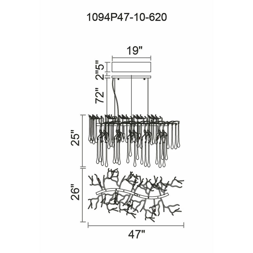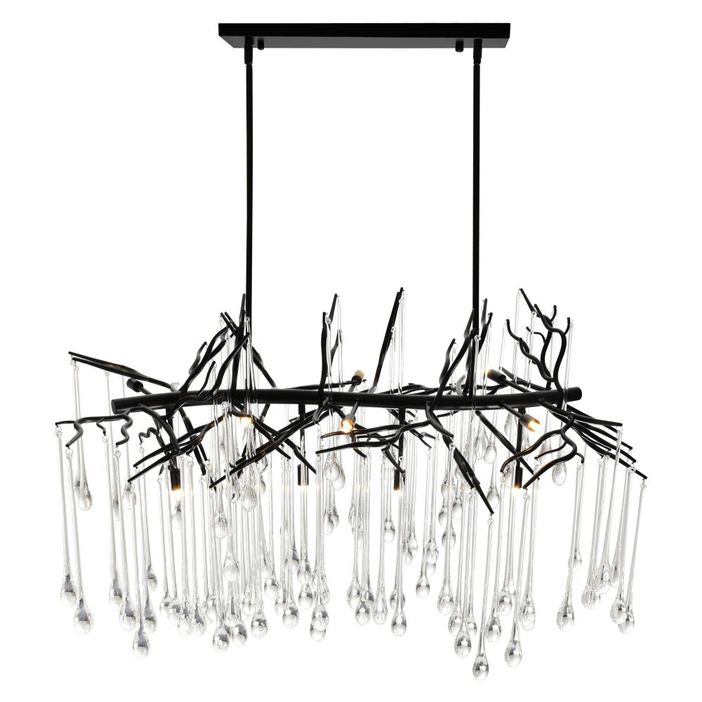 The Anita 10 Light Chandelier has a charm of its own. Finished in black, this sculptural down chandelier features a tree branch frame measuring 47 inches long. Clear long crystal drops hang from it. This impactful light fixture will certainly bring drama a