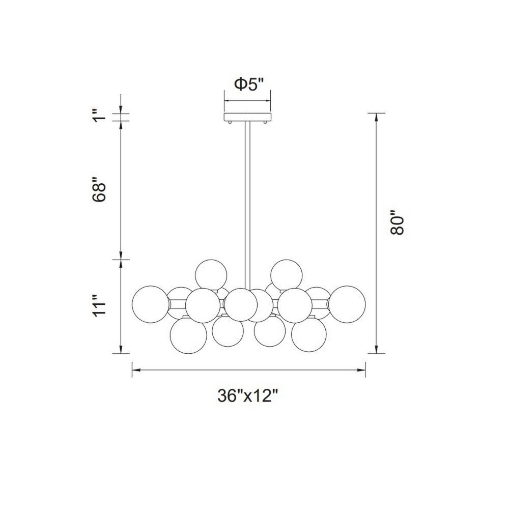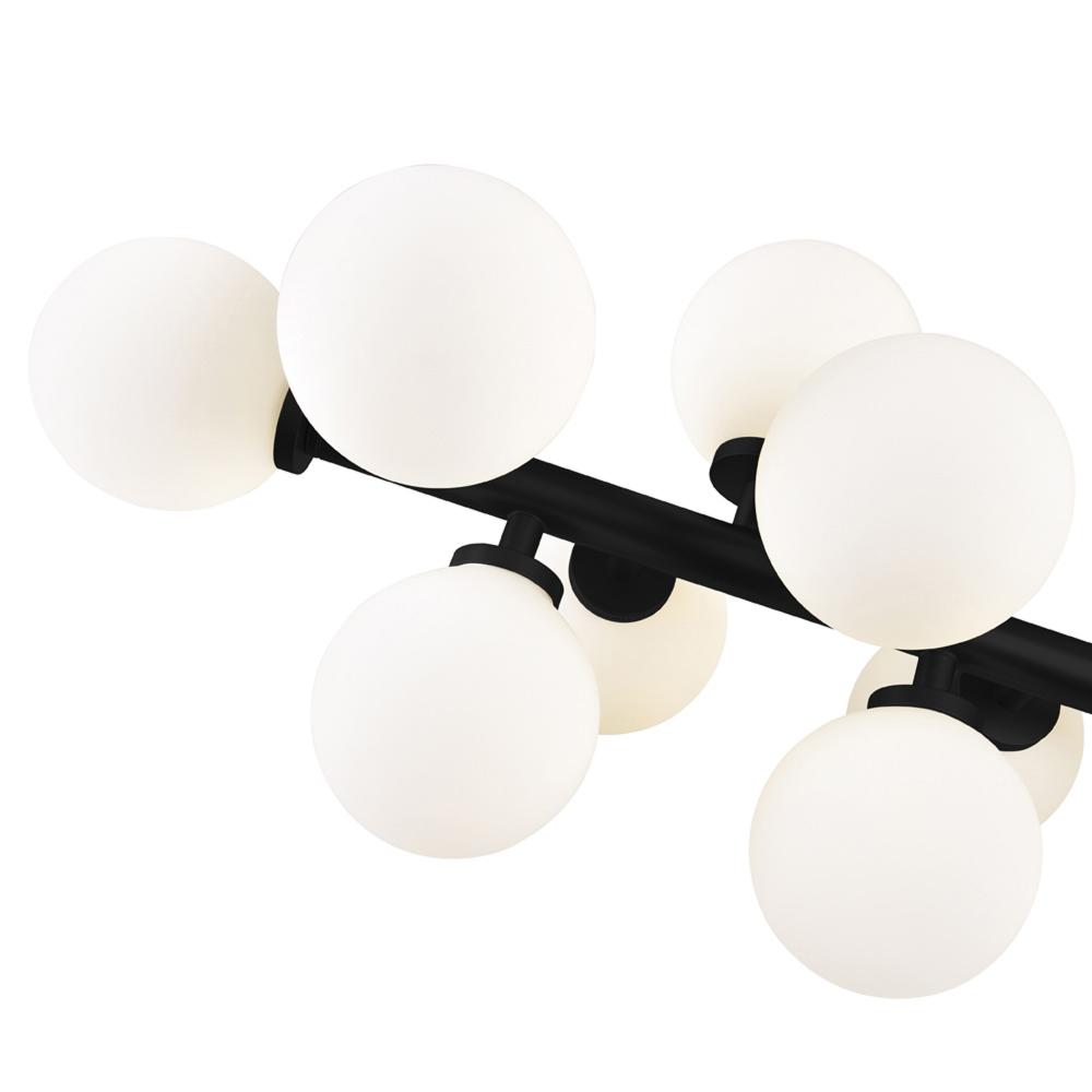 The Arya 16 Light Chandelier in black will add a sophisticated sculptural presence to any indoor space. Sixteen frosted glass globes with LED light are affixed to a black horizontal metal rod that suspends from an adjustable downrod. This linear chandelier