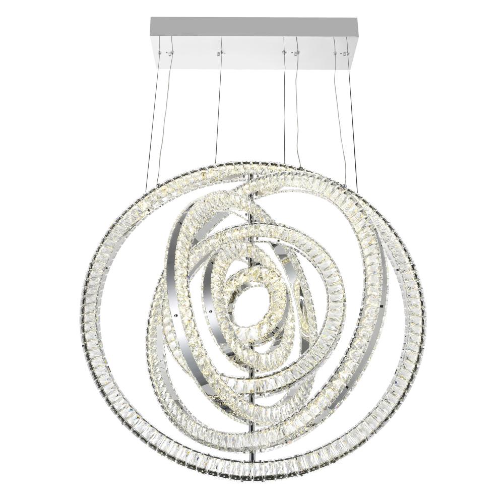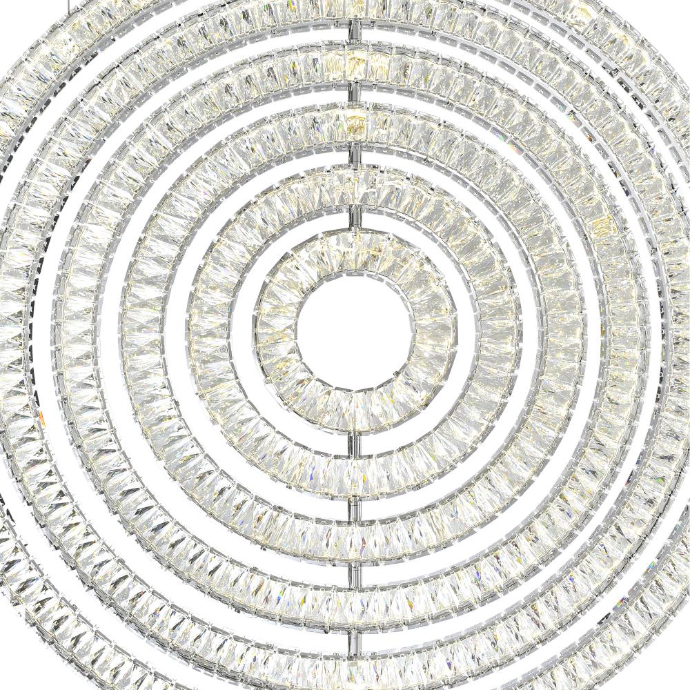 This shapely 37 inch Celina LED Chandelier can effortlessly reinvent the look of your living space. It features a glittering pendant with a silhouette reminiscent of an archery target. This round pendant allows you to subtly play with shape and scale while