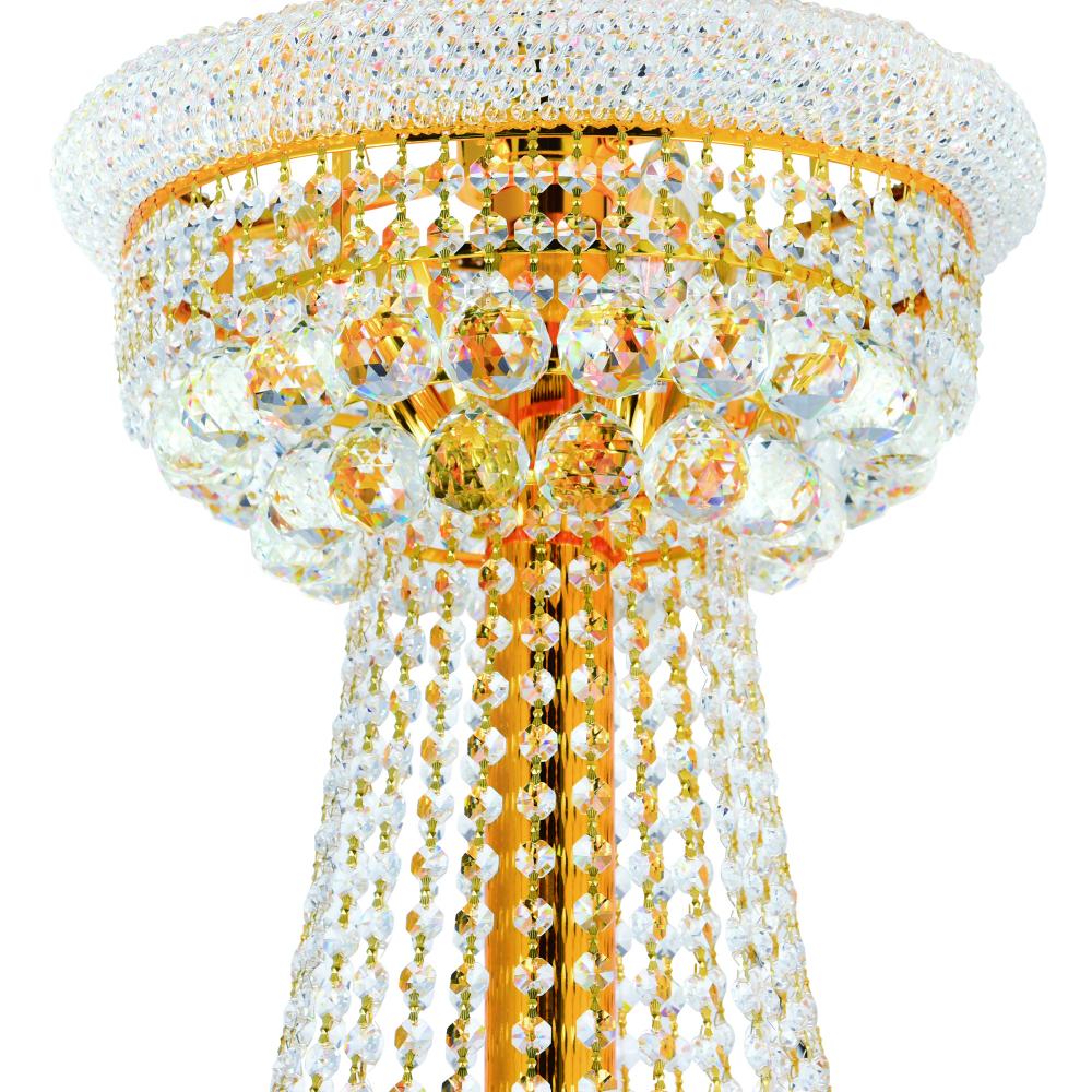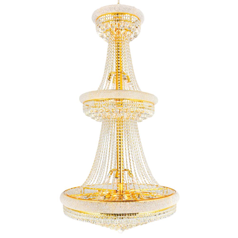 The Empire 34 Light Chandelier is an oversized three Tiered down chandelier that won't fail in making a statement. Dressed in crystals, this light source has a gold-finished hardware and a candelabra-style frame holding 34 bulbs. Perfect as an entryway