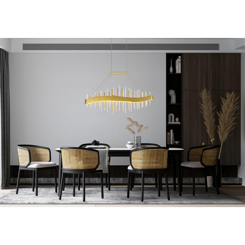 The Millipede 40 inch LED Chandelier in Satin Gold is here to help define the ambiance in your space. This modern interior lighting option features a curvy rectangular metal base adorned on its top and bottom edges with clear and gold glass tubes. As it di
