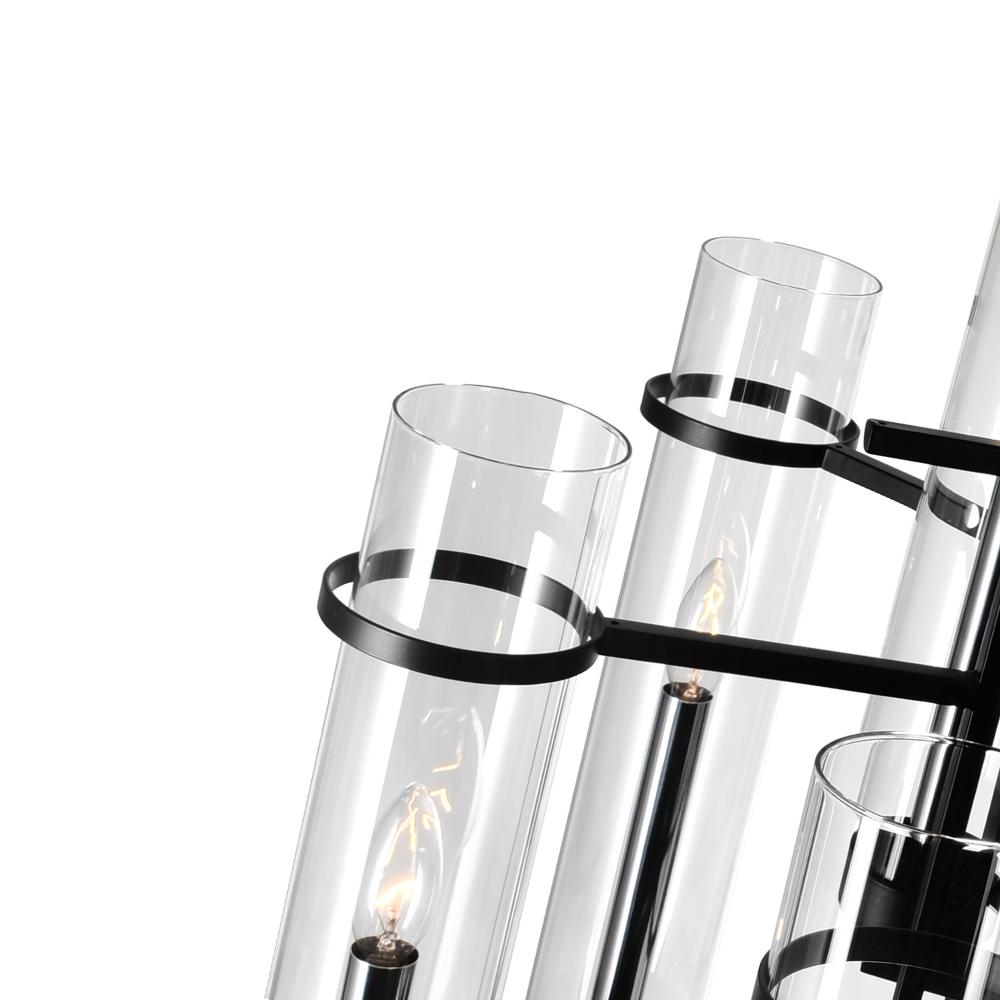 The Sierra 8 Light Chandelier features an elegant design inspired by the past and the present. Cylindrical clear glass shades hold candelabra bulbs in enclosure. A black metal frame forming a 26 inch round framework complete the contemporary look of this p