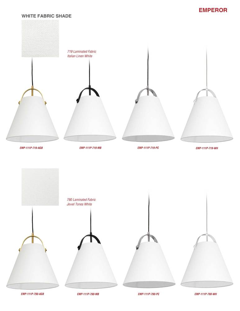 The Emperor family of lighting makes a clear statement about your sense of style. Its tapered silhouette creates a versatile look that can work with any contemporary furnishings. The metal frame drops to a bell style fabric shade. The two basic elements are joined by a curved metal design element on the top side of the shade that draws the eye, and gives Emperor lighting its distinctive profile. Emperor lighting will enhance your décor in a stylish kitchen or dining room, or a main hallway in your home.
