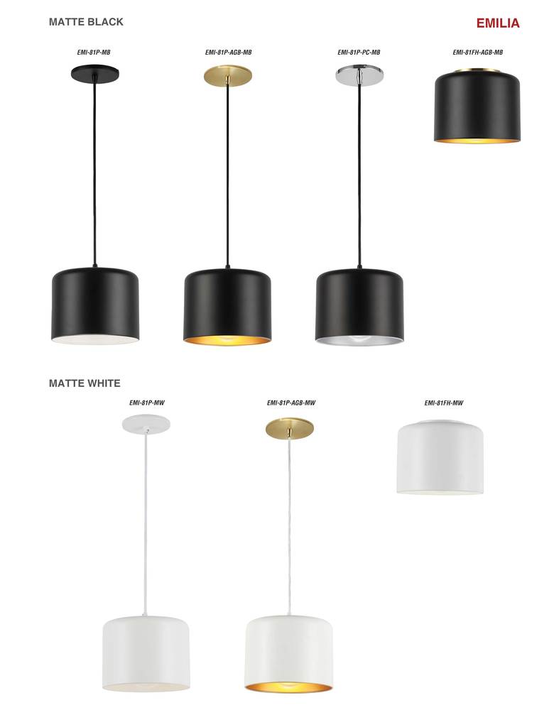 A stylish silhouette characterizes the Emilia family of lighting, adding a couture-style element of luxury to your home. It combines the solid presence of mid-century design with sleek modern edge. The all metal construction comes in a variety of finishes, and includes a contrasting or complementary finish on the inside of the fixture that allows you to refine the look to your needs. It's a versatile style of lighting that will create a focal point in any room. Emilia lighting works well with modern or transitional kitchens or dinettes, foyer or other main hallway.