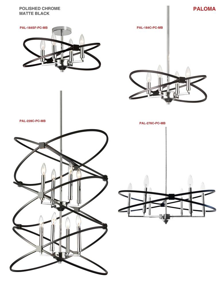 Paloma lighting takes center stage, with its beguiling combination of circular and vertical lines blended with artistic flair. The design evokes traditional motifs and forms, while adding a distinctly space age edge. The unique look is crafted in metal in two contrasting finishes. A simple drop leads to horizontal arms, with the traditional chandelier lights housed vertically. Horizontally, a double circle loops around at an angle. The effect adds a noticeable pop of designer style to living and dining rooms, and sets a distinctive note in your foyer.