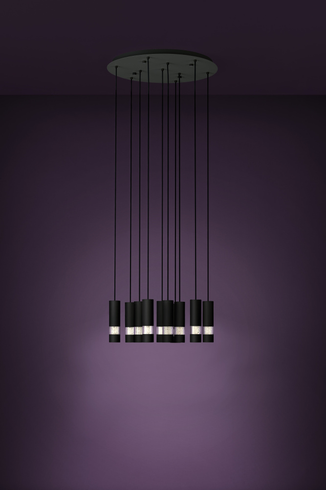 The BERNABETA LED pendant light features ten cylindrical shades and a black ceiling mount. In the lower part of eachshade there is a clear seeded diffuser, which creates a distinctive lighting effect in the room. The pendant light is the perfect finishing touch for modern and minimalist interiors,
