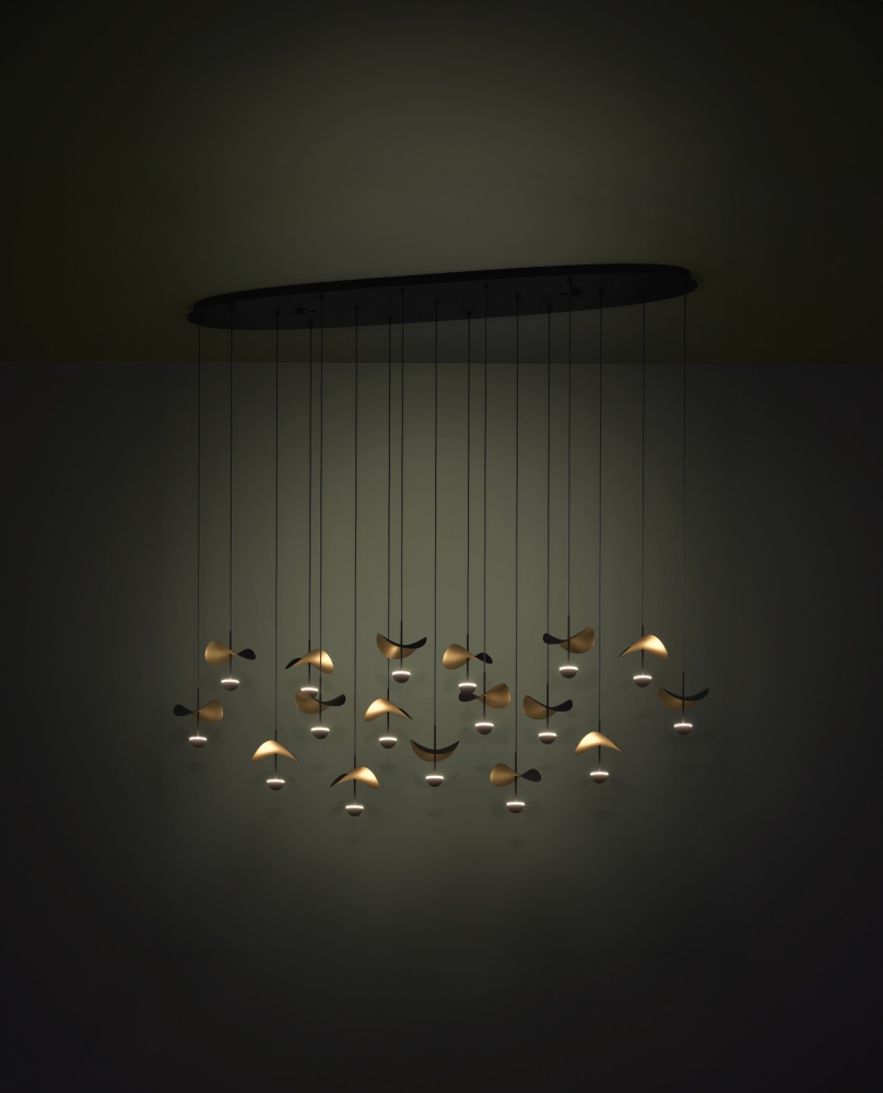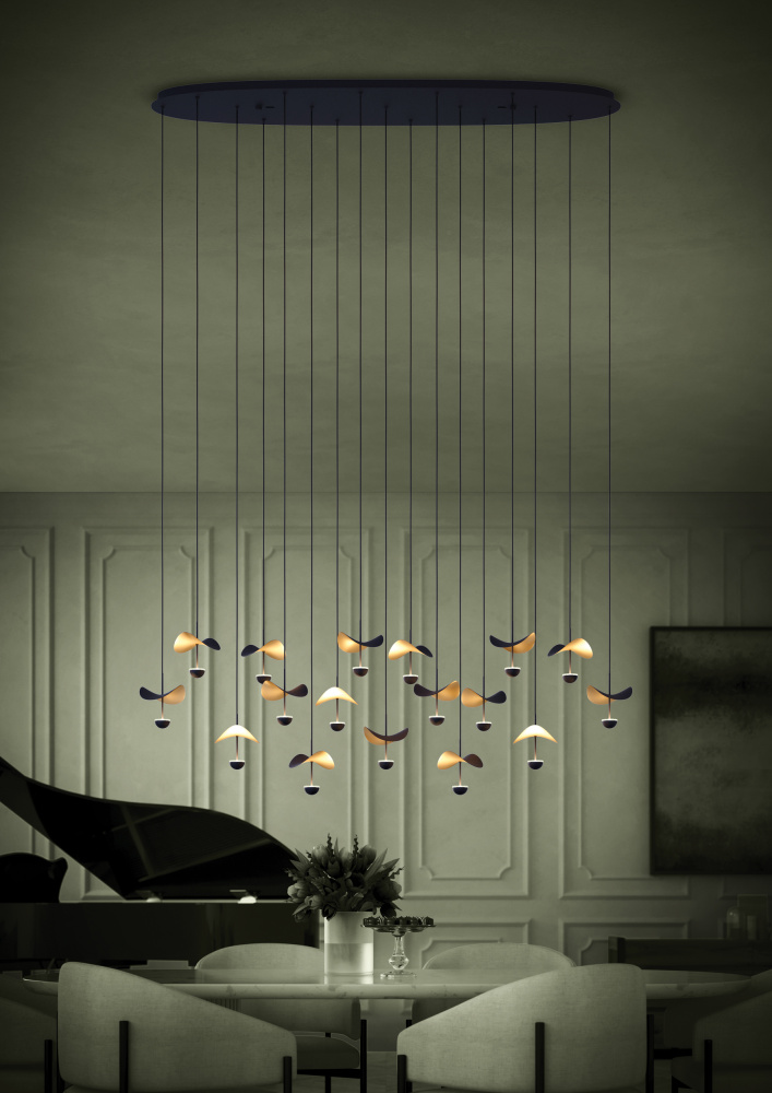 The DRACERA 17-Light pendant features an elegant design using an oval black canopy to anchor a series of slender cables, each on drops to a slender aluminum pringle shaped shade & under the shades sit integrated LED lights set within a conical housing at differing heights.