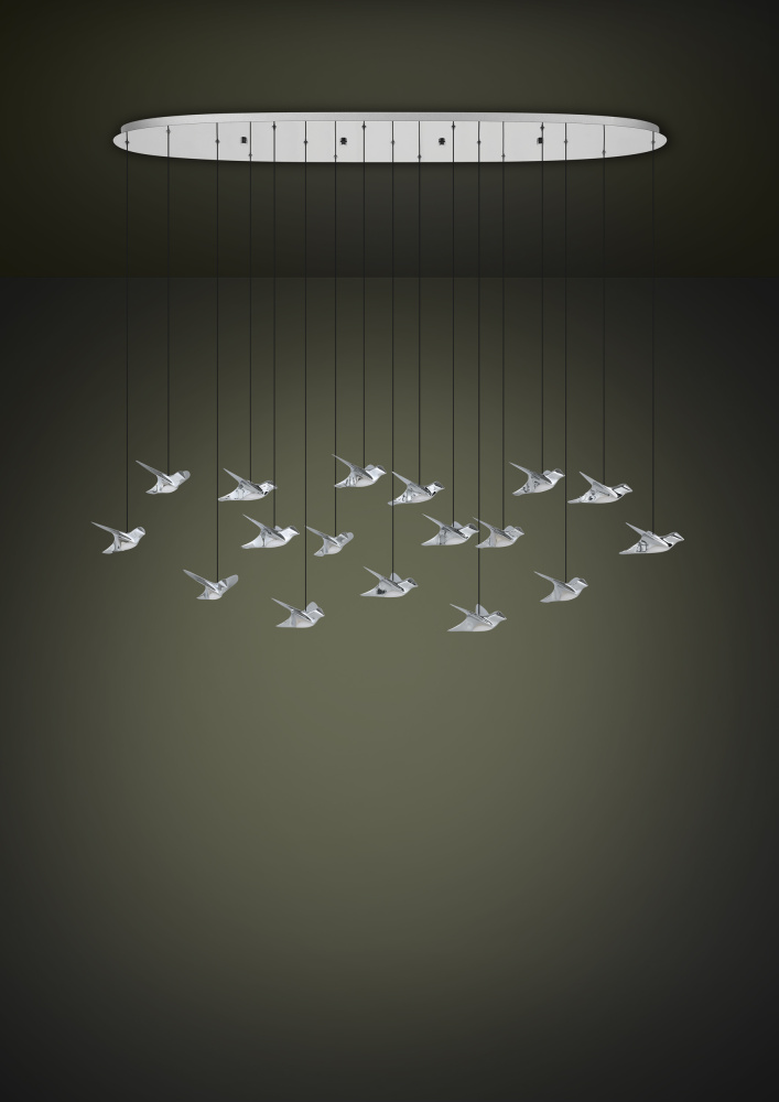 The PARATEBUENO LED linear pendant consists of an oval chrome canopy, from which 17 chrome birds are suspended on black textile cables. The integrated LEDs on the birds' bellies provide pleasant warm white light. The hanging lamp fits perfectly into modern installations and, thanks to the special suspension, is reminiscent of a mobile.