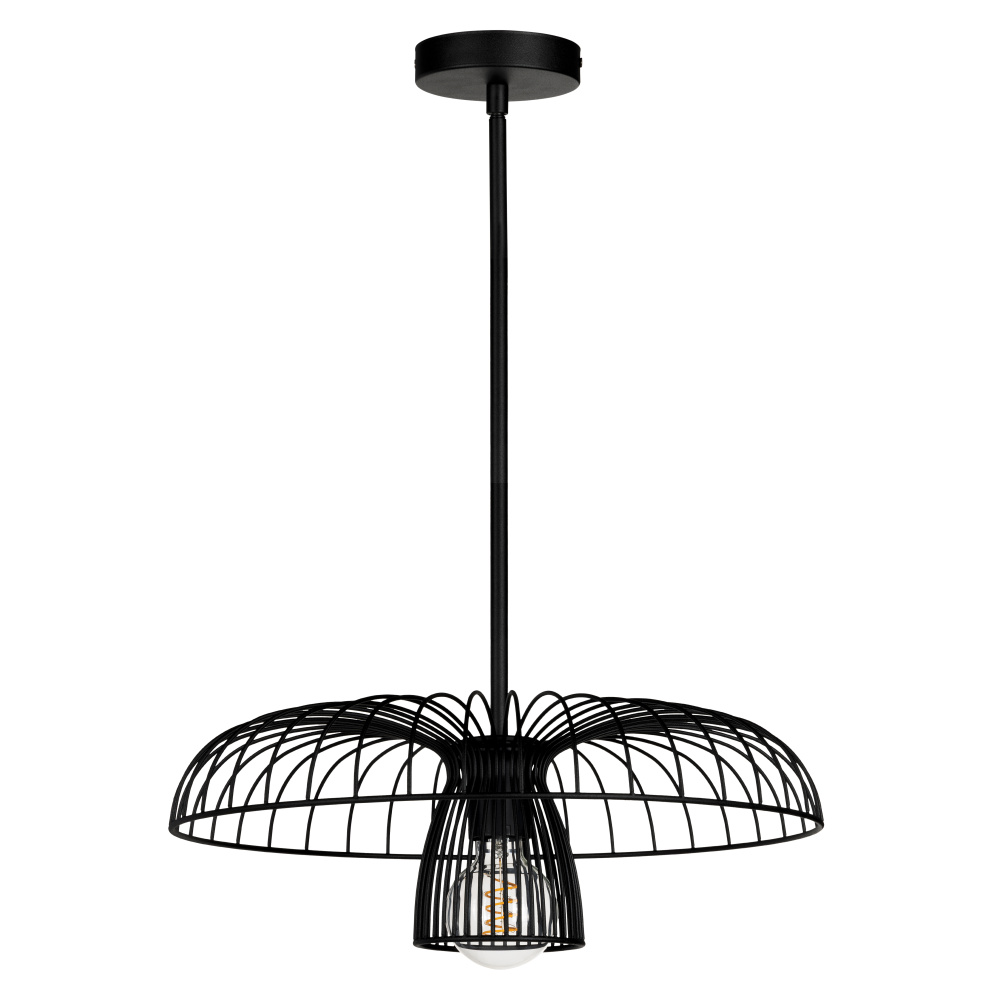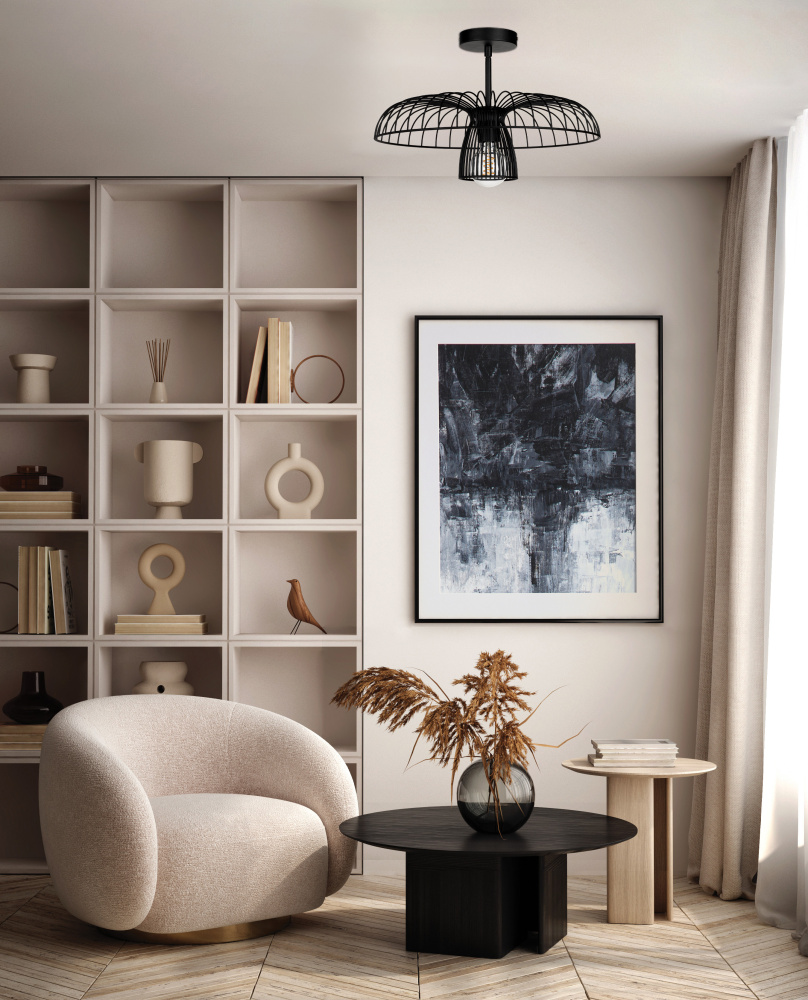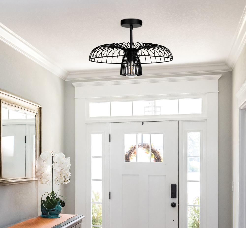 The Champerico semi flush mount features an exposed bulb that’s encircled in a cage of black wires that pinch inward and bloom up and over the light. The open framework of the shade creates a unique interplay of light and shadow in the room. Additional rods are included allowing the light to be installed as a pendant for increased versitility. Its unique and modern look will create an eye-catching feature in your home, whether in the living room or above the dining room table.