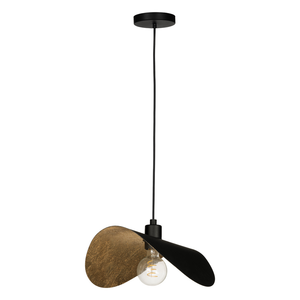 The Saceda is a whimsical, modern convertible pendant light featuring a wide, curved black metal shade. Composed of a sleek black canopy and shade lined with gold leaf, it will be a captivating contrast that adds a touch of luxury to any room. The underside of the shade features hand-applied gold leaf to reflect the light from the bulb (not included). With its adaptable design, this fixture includes two canopies, letting you choose between a pendant installation or a flush mount to suit your space. Ideal for dining areas, kitchens, or living spaces, this pendant offers a soft, ambient glow, enhancing the atmosphere with its unique, sculptural form.