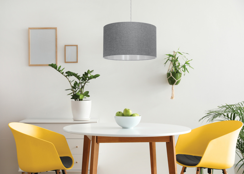 The MANDANA pendant features a round lamp shade made of gray fabric and a matte nickel metal suspension. The shade is combined with a silver-colored interior, skillfully rounding off the modern design. This pendant blends seamlessly into minimalist interiors and offers cozy lighting for any room—whether in the living room, bedroom, or in the dining room above the dining table.