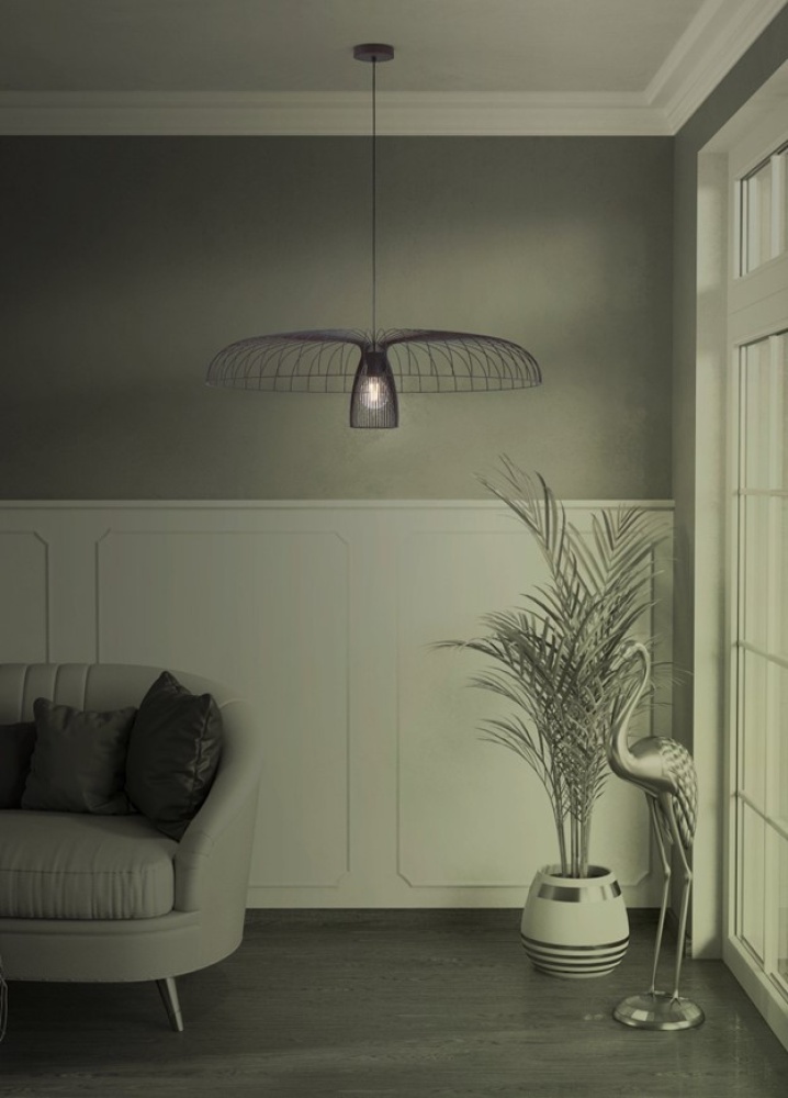 The Champerico pendant light features an exposed bulb (not included) that’s encircled in a cage of black wires that pinch inward and bloom up and over the light. The open framework of the large shade creates a unique interplay of light and shadow in the room. Its unique and modern look will create an eye-catching feature in your home, whether in the living room or above the dining room table.