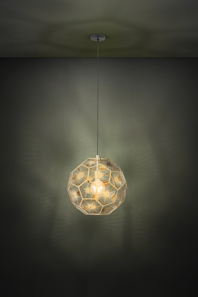 The SKOURA pendant has a large, gold-coloured metal lampshade in a chic geometric design paired with a black metal canopy. When the light is on, it creates a fascinating play of light and shadow through the cut-out detailing. The elegant pendant light integrates perfectly into modern interiors and will create a distinctive, eye-catching feature in your home.