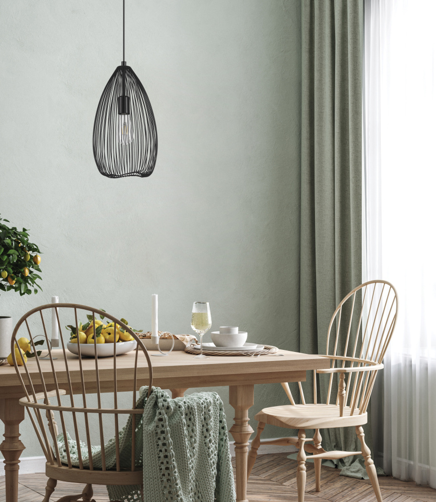 The CLEVEDON pendant light has a teardrop-shaped wire shade in black paired with a round black metal canopy. The lampshade creates a fascinating play of light and shadow as soon as the light is on. The pendant light blends seamlessly into modern interiors. The design provides distinctive lighting for any space, whether in the living room or dining room.