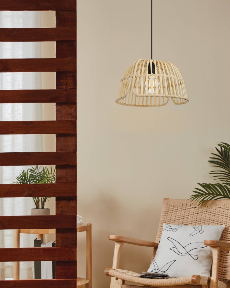 The Glyneath Pendant features a dome shaped bamboo shade hung from a 72" black textile cable with a black circular canopy. The cable is height adjustable so you can obtain that perfect height for your needs. When the light is transmitted through the bamboo lampshade, it will produce a very butiful mottled lighting effect, which greatly increases the warm atmosphere of your space. It requires a 1-60W E26 bulb that is not included.