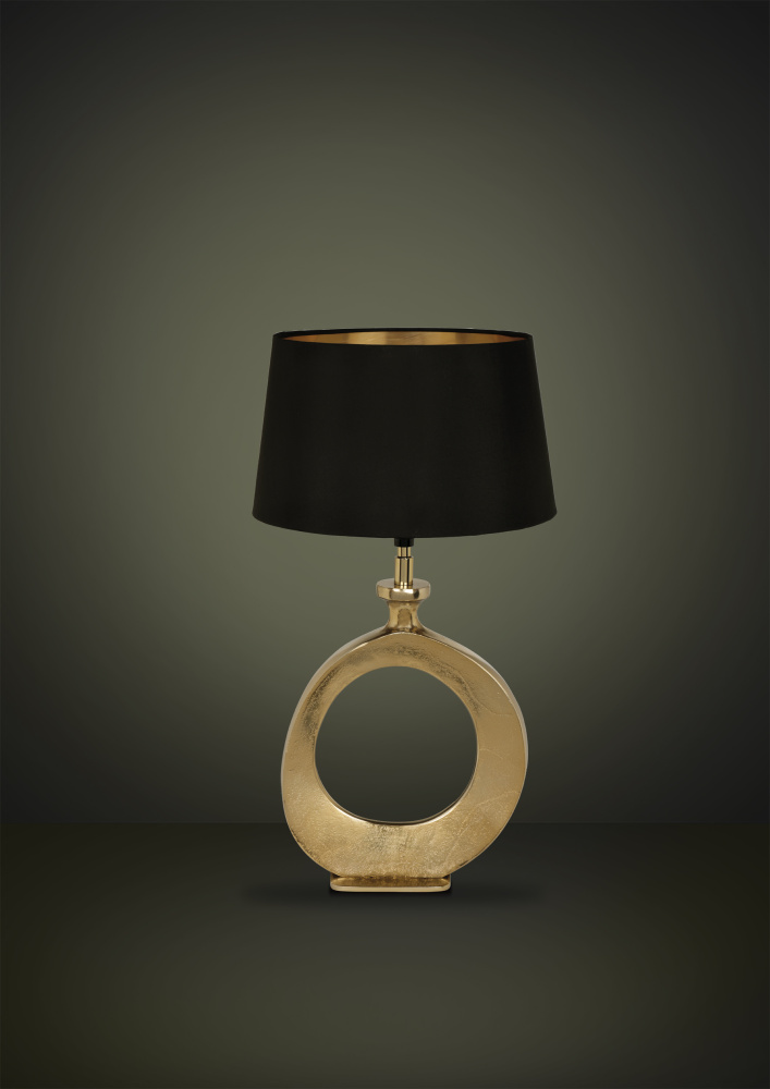 The Diezma table lamp illuminates any space with a touch of timeless elegance. This lamp features a sculptural gold metal base with a smooth open circular design and a sleek black fabric shade with a gold interior. This lamp adds drama to any room of the house.