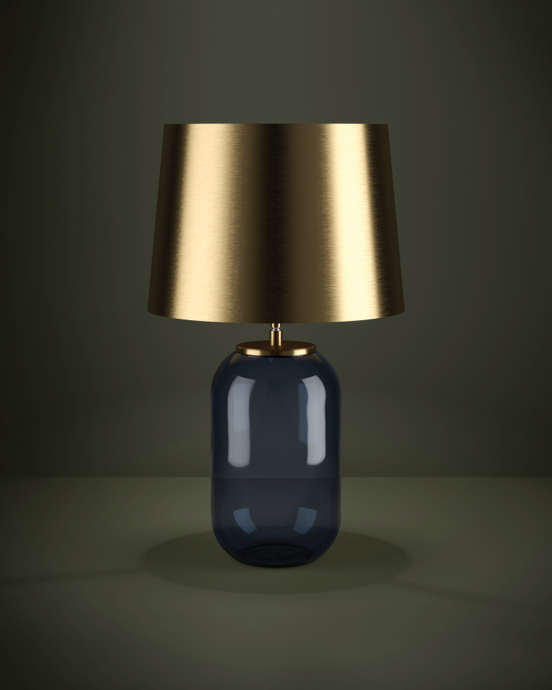 The CUITE table lamp features a transparent indigo oval glass base and a conical brushed brass metal shade. This classic combination of glass and metal gives the light a well-balanced yet compelling appearance. The design blends superbly with various styles of interiors.