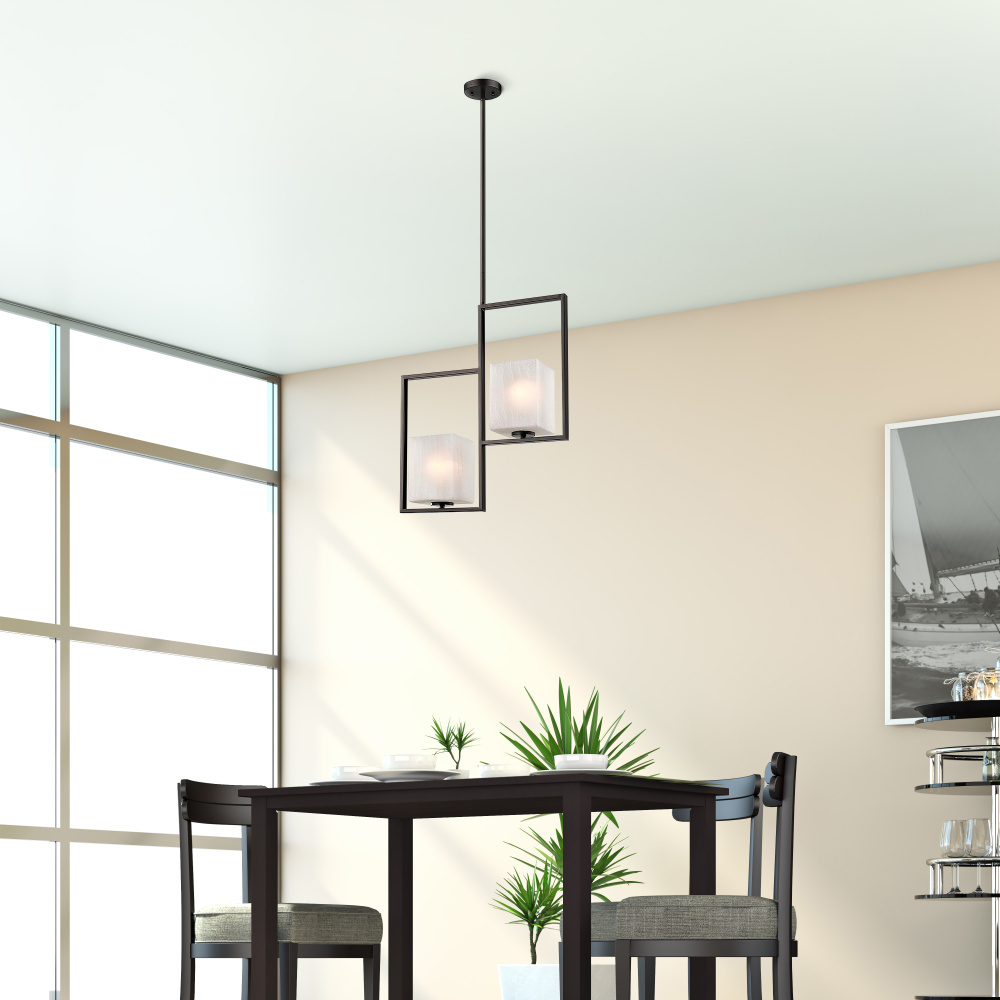 The Wilmingtom two Light Pendant presents a clean and straightforward piece with layered boxes that create an intriguing sense of depth. The bold two-tone oil rubbed bronze and Chrome finish aesthetic is a subtle nod to Modern style, while still having a minimal composition overall. Two Opal Glass Shades creat a lit atmosphere with a sense of timeless style.