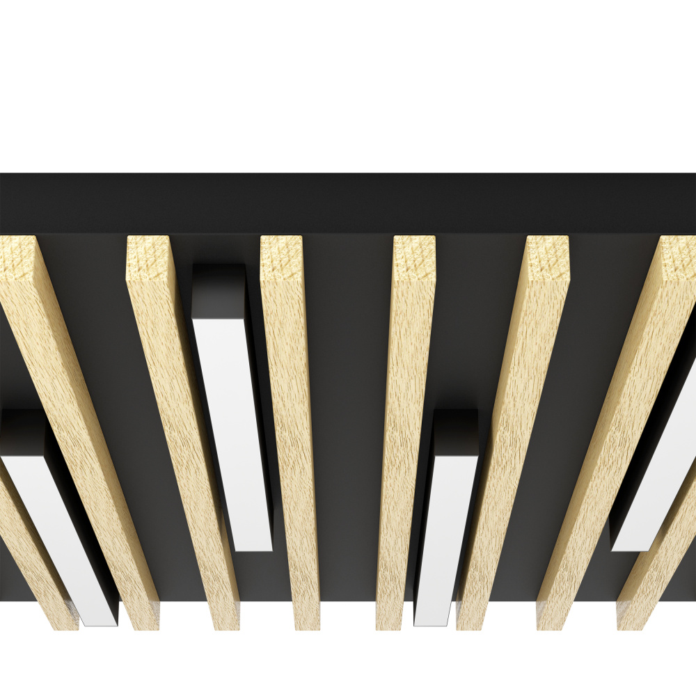 The MARREIRA LED ceiling light features a square black metal body fitted with oak veneer elements combined with six LED profiles offset from one another. The integrated LEDs under the acrylic diffusers produce a pleasant warm white light. The modern ceiling light omplements minimalist and natural-style interiors, creating cozy lighting in any space