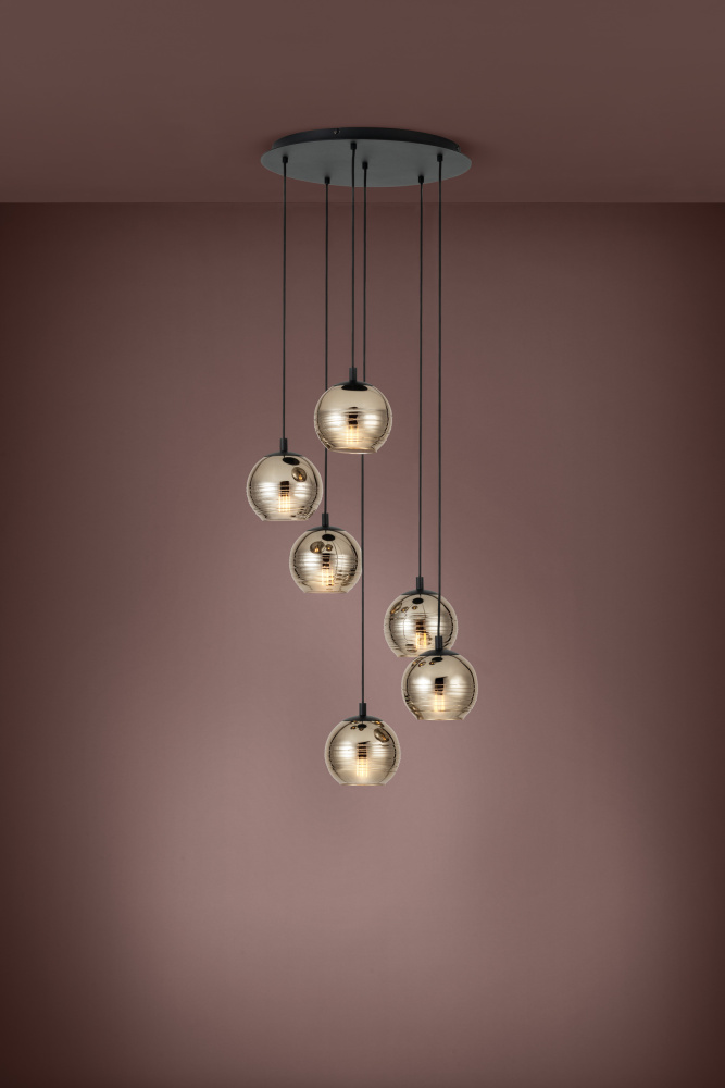 The LEMORIETA pendant light has six spherical gold smoked glass shades. The shades are suspended at different heights from a black metal canopy. The shades grooved texture stylishly complements the modern design. With its elegant look, the design blends superbly into modern interiors, creating a distinctive, eye-catching feature in your home