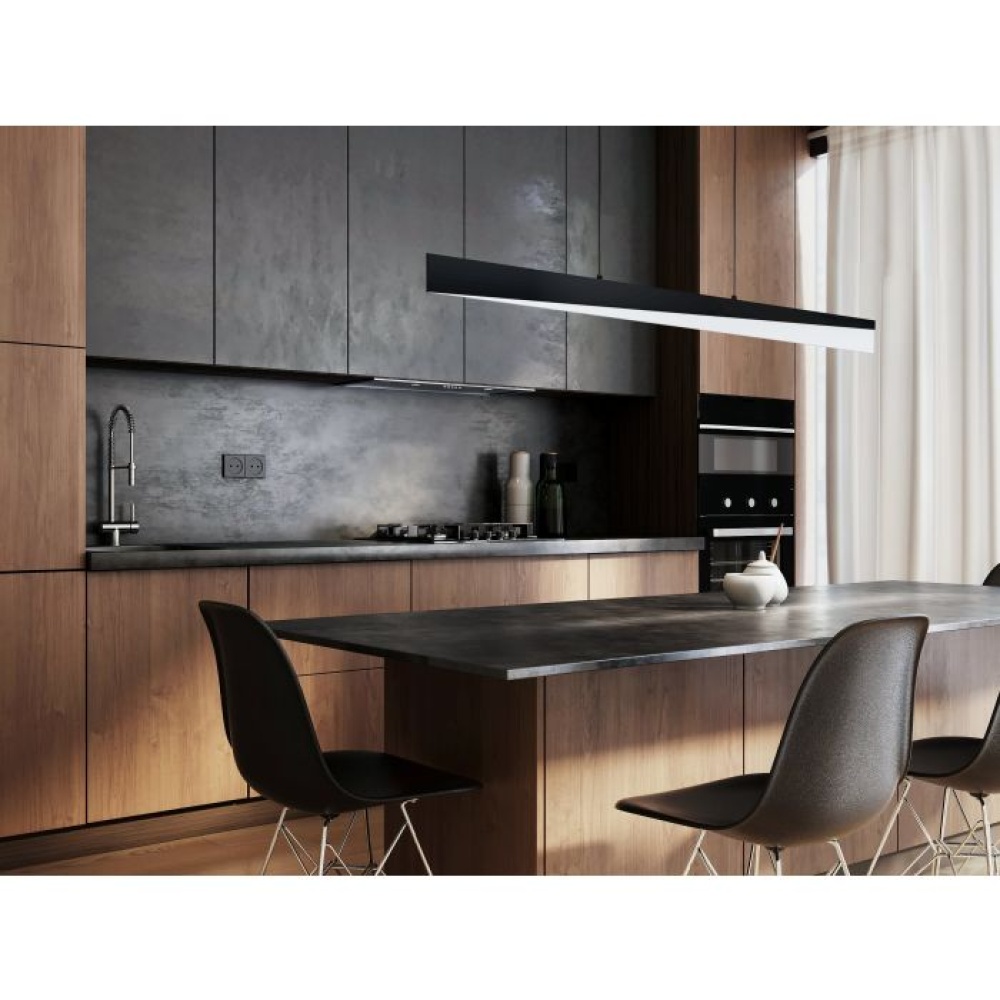 The ISIDRO LED pendant light is made of a black metal LED profile with a satin acrylic cover. The diagonal design of the metal excitingly emphasizes the linear look of the lamp. The integrated LED provides a pleasant warm white light. The modern sleek design fits into almost every living trend and offers pleasant lighting in the living room or dining room, for example above an elongated dining table.