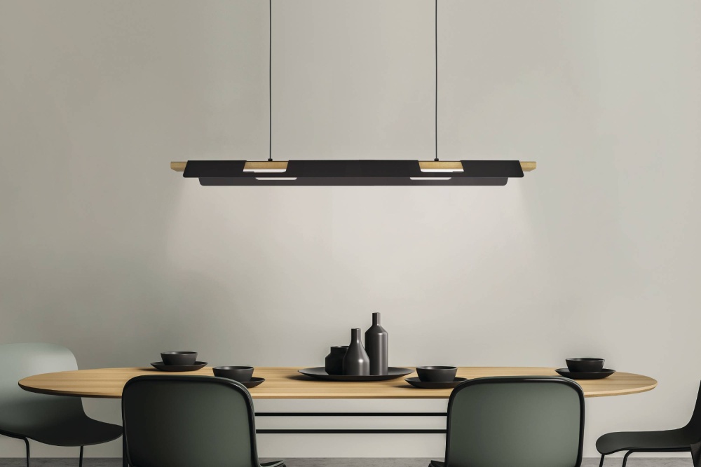 The ERMUA LED Linear Pendant features a black metal shade overlaying natural wood giving this pendant a rustic design. This openwork fixture mixes real wood and black finish metal for a distinctive industrial look. The style is sure to become the focal point in your home.