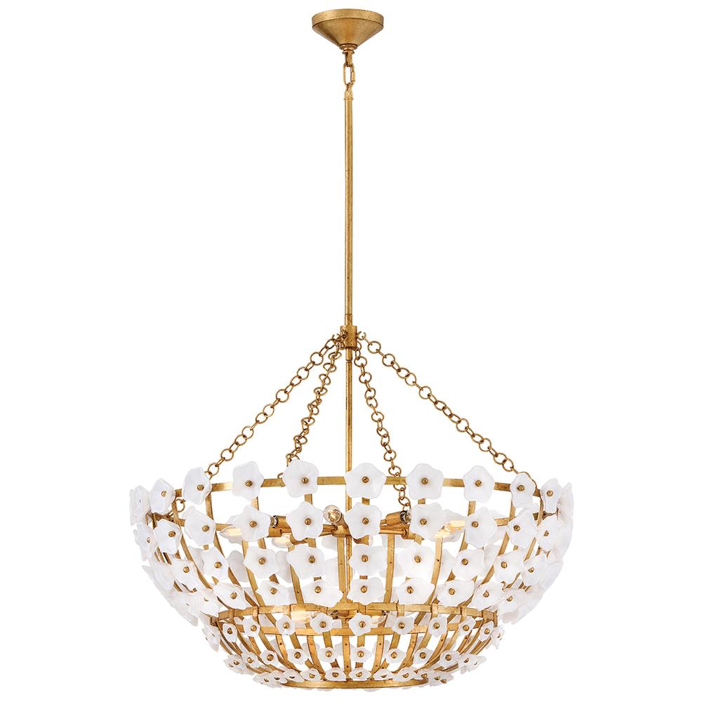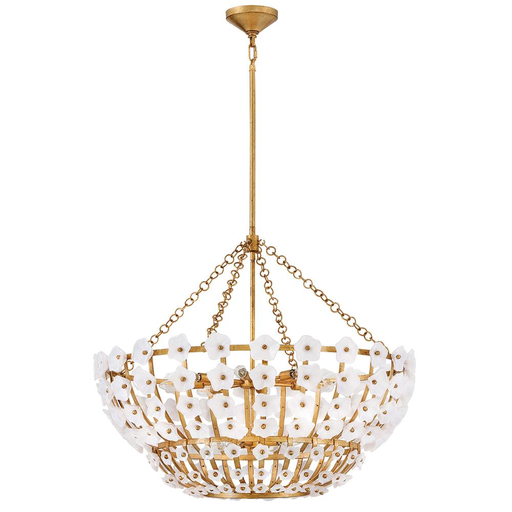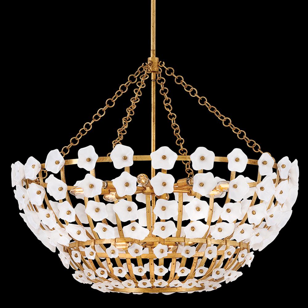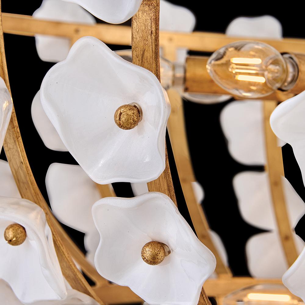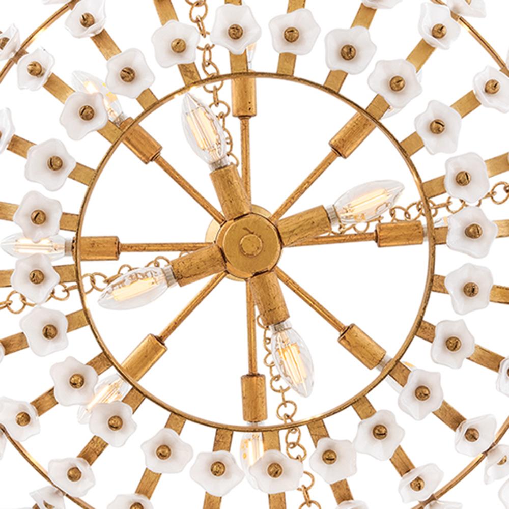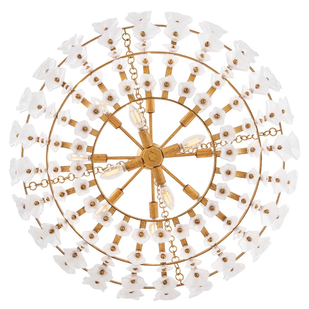 Inspired by the natural romance of annual spring blooms, Azalea’s intricate silhouette is adorned with double-layered glass blossoms crafted from clear and white glass. A Distressed brass frame complements an abundance of warm, ambient illumination from dimmable candelabra lamps.