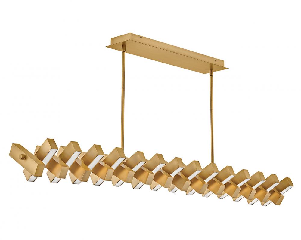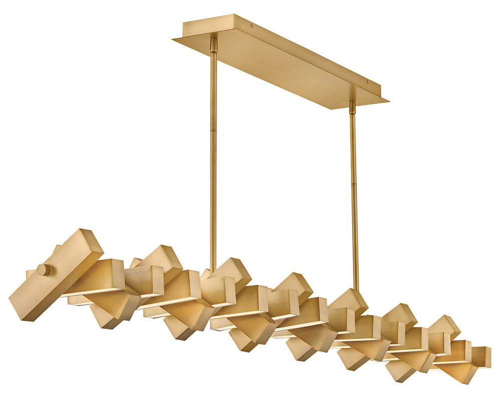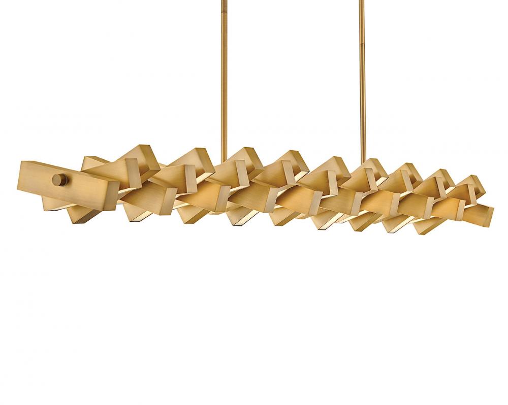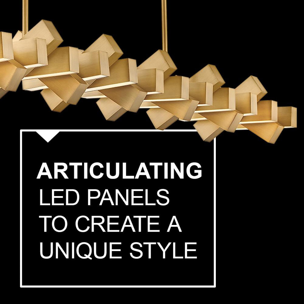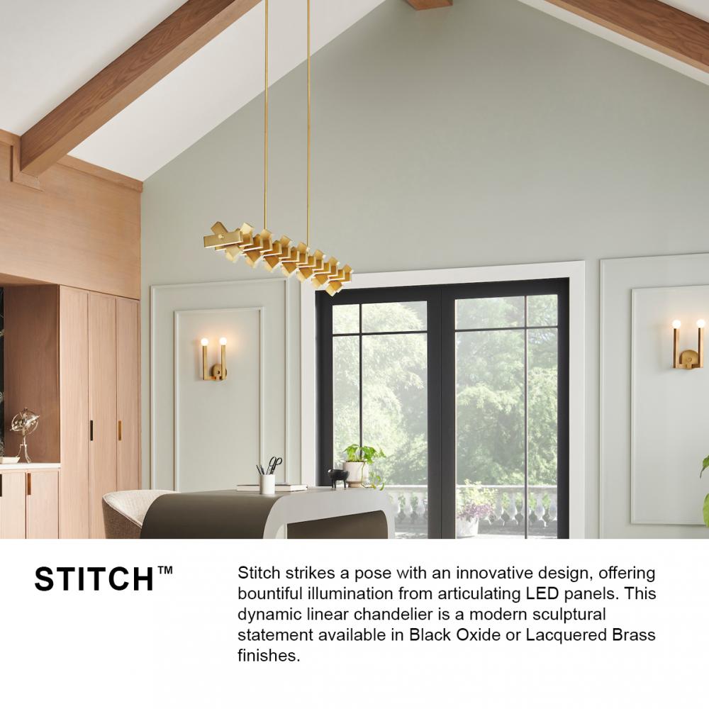 Stitch strikes a pose with an innovative design, offering bountiful illumination from articulating LED panels. This dynamic linear chandelier is a modern sculptural statement available in Painted Black Oxide or Lacquered Brass finishes.