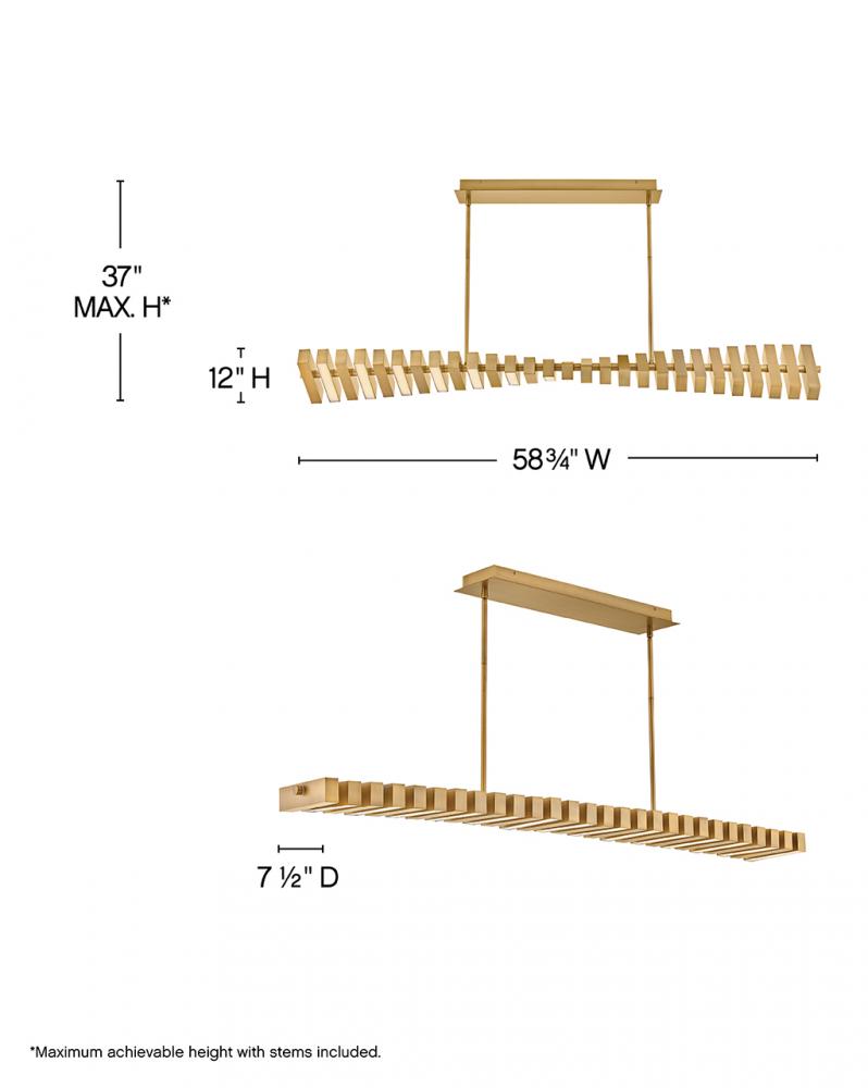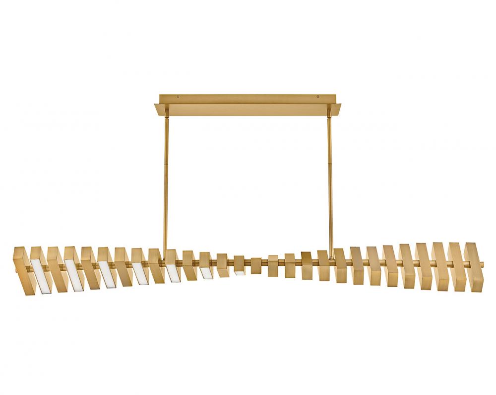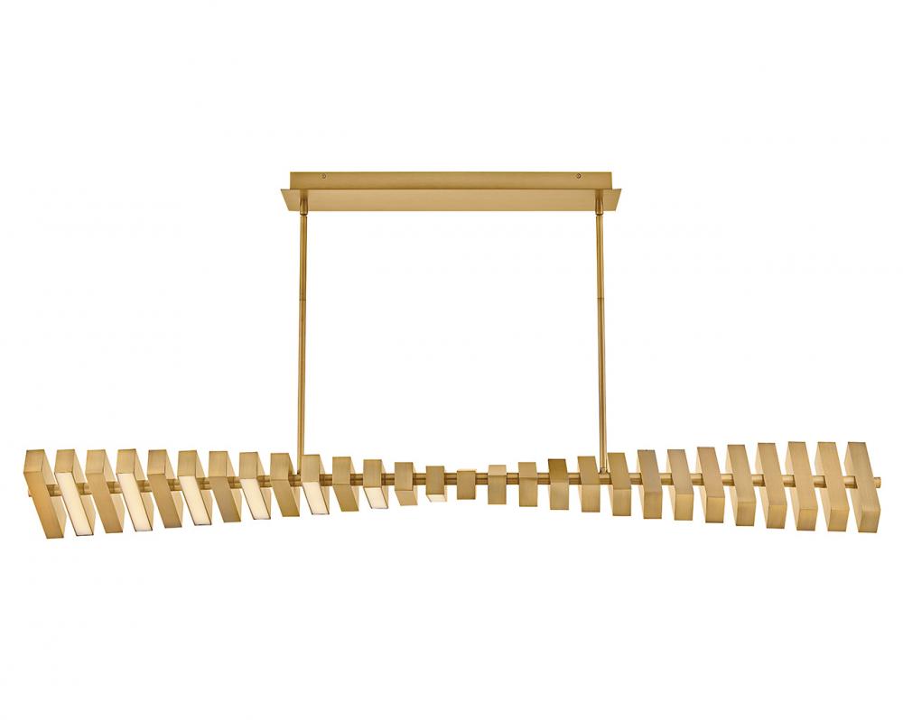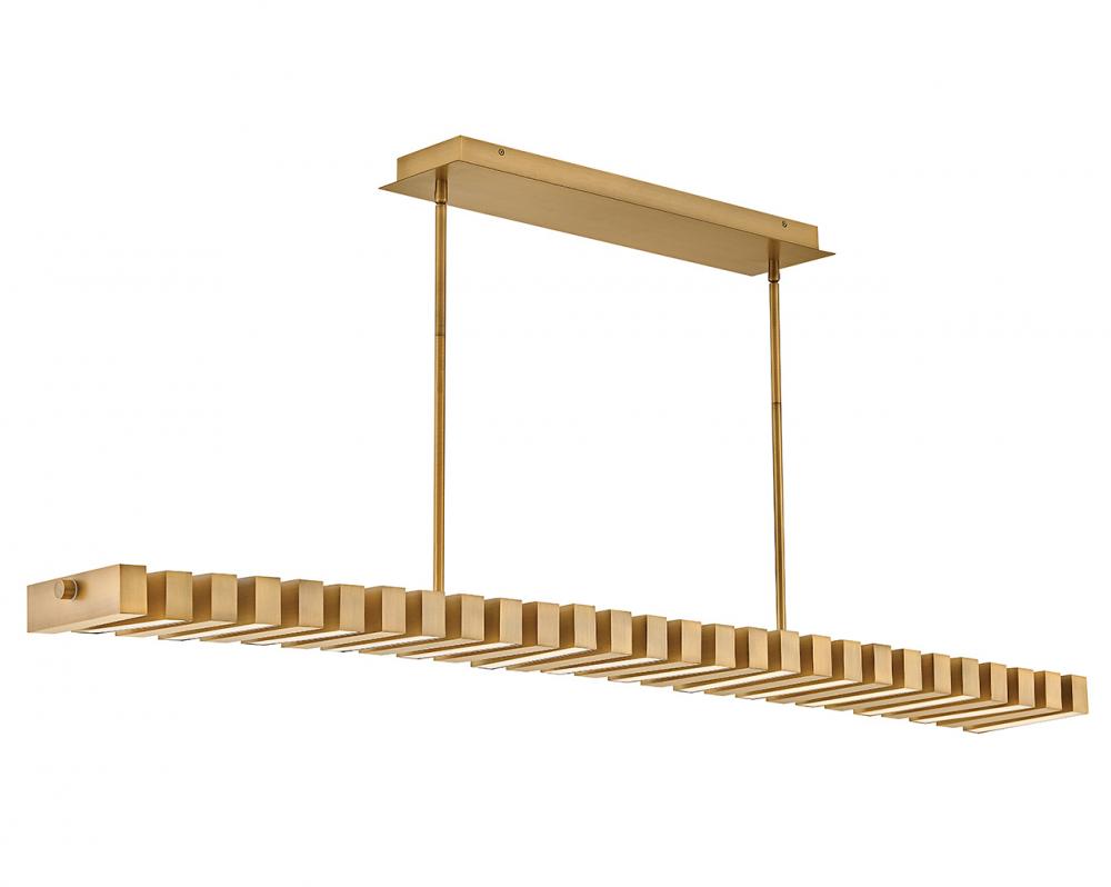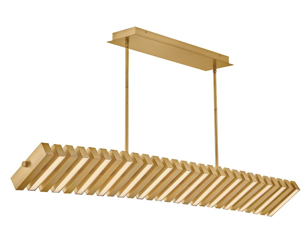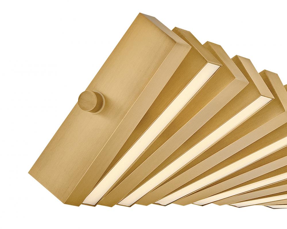 Stitch strikes a pose with an innovative design, offering bountiful illumination from articulating LED panels. This dynamic linear chandelier is a modern sculptural statement available in Painted Black Oxide or Lacquered Brass finishes.