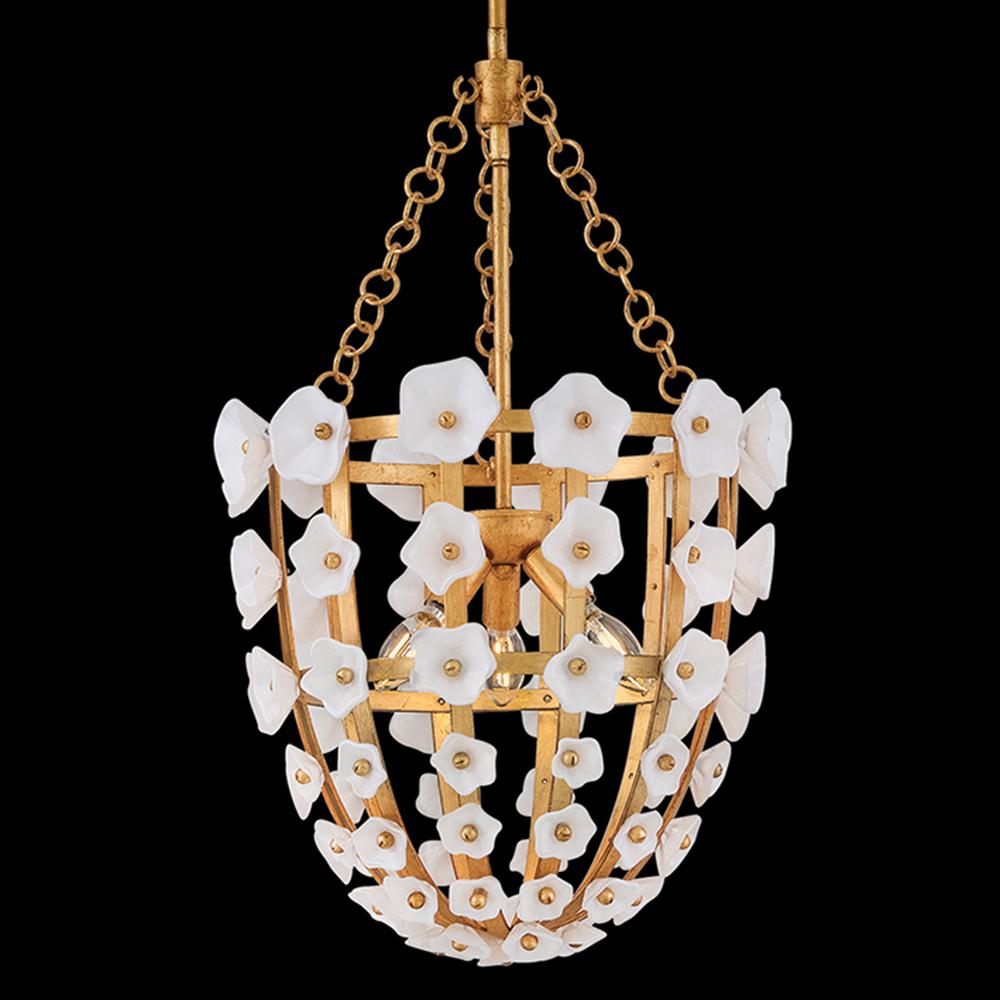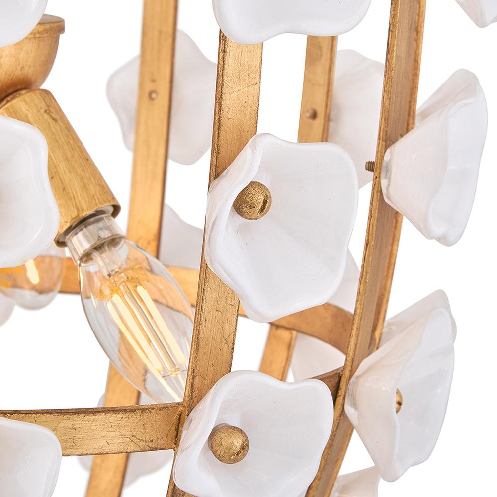 Inspired by the natural romance of annual spring blooms, Azalea’s intricate silhouette is adorned with double-layered glass blossoms crafted from clear and white glass. A Distressed brass frame complements an abundance of warm, ambient illumination from dimmable candelabra lamps.