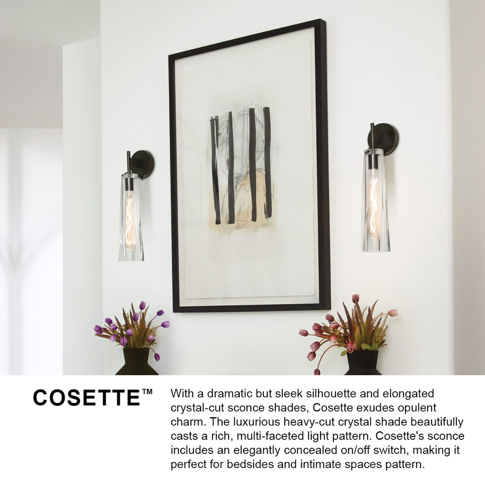 With a dramatic but sleek silhouette and elongated crystal-cut sconce shades, Cosette exudes opulent charm. With two luxurious heavy-cut crystal shade options, smokey gray or clear, both beautifully cast a rich, multi-faceted light pattern. Cosette’s sconce includes an elegantly concealed on/off switch, making it perfect for bedsides and intimate spaces pattern.