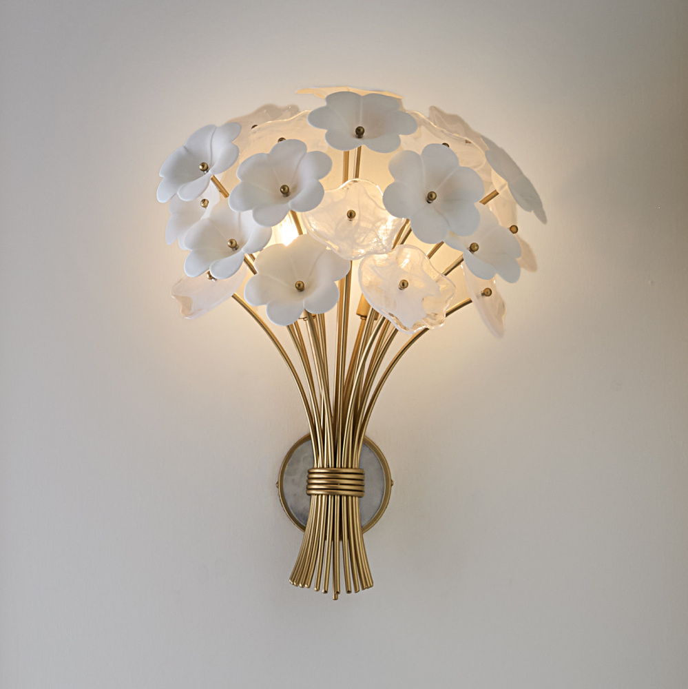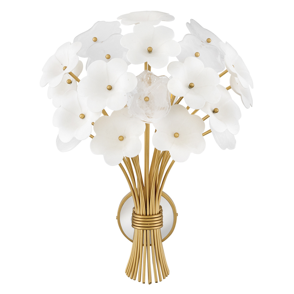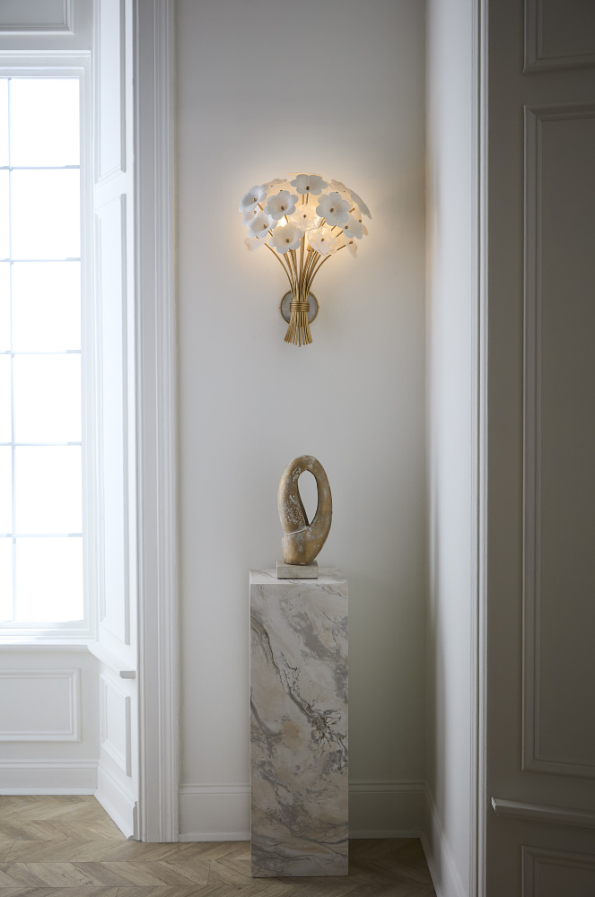 Decadently arranged in glamorous clusters, Marianne’s white glass and ceramic blossoms create an elegant, organically inspired silhouette enhanced by a luxurious glow. Intricate frames in our Deluxe Gold finish capture warm, inviting illumination