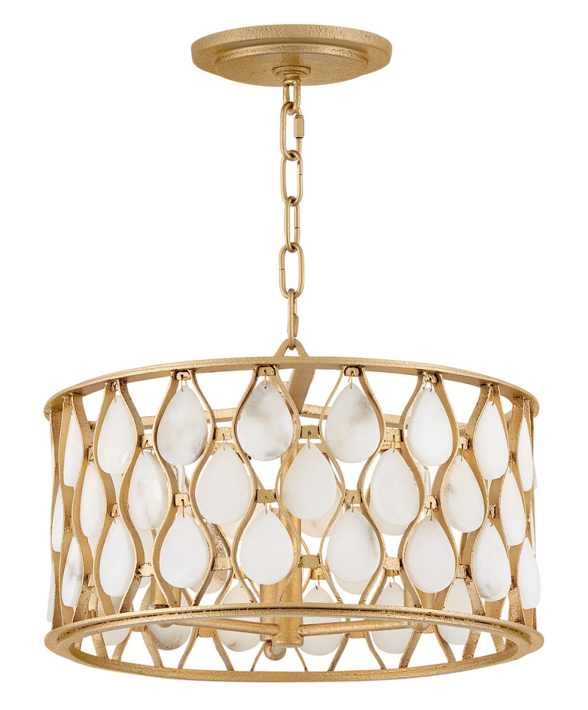 Opulently adorned with natural alabaster stones held within a traditional latticework shade, Estie brings organic elegance to any aesthetic. Intricately curved metalwork complements the frame, chain, and canopy in a textured Piastra Gold finish.