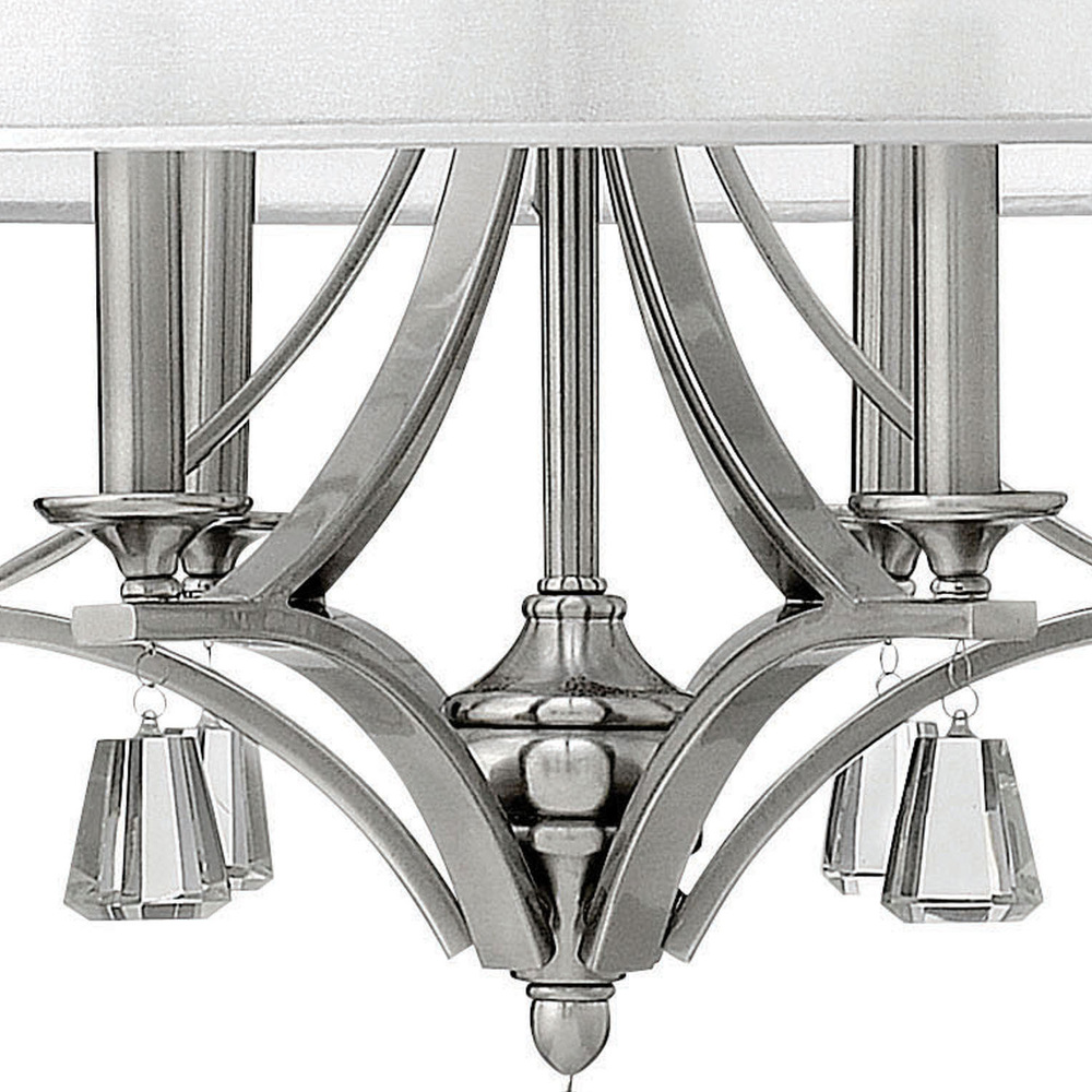 This elegant collection in a Brushed Nickel and French Bronze finish features a sheer translucent double hardback shade and tapered square crystal accents.