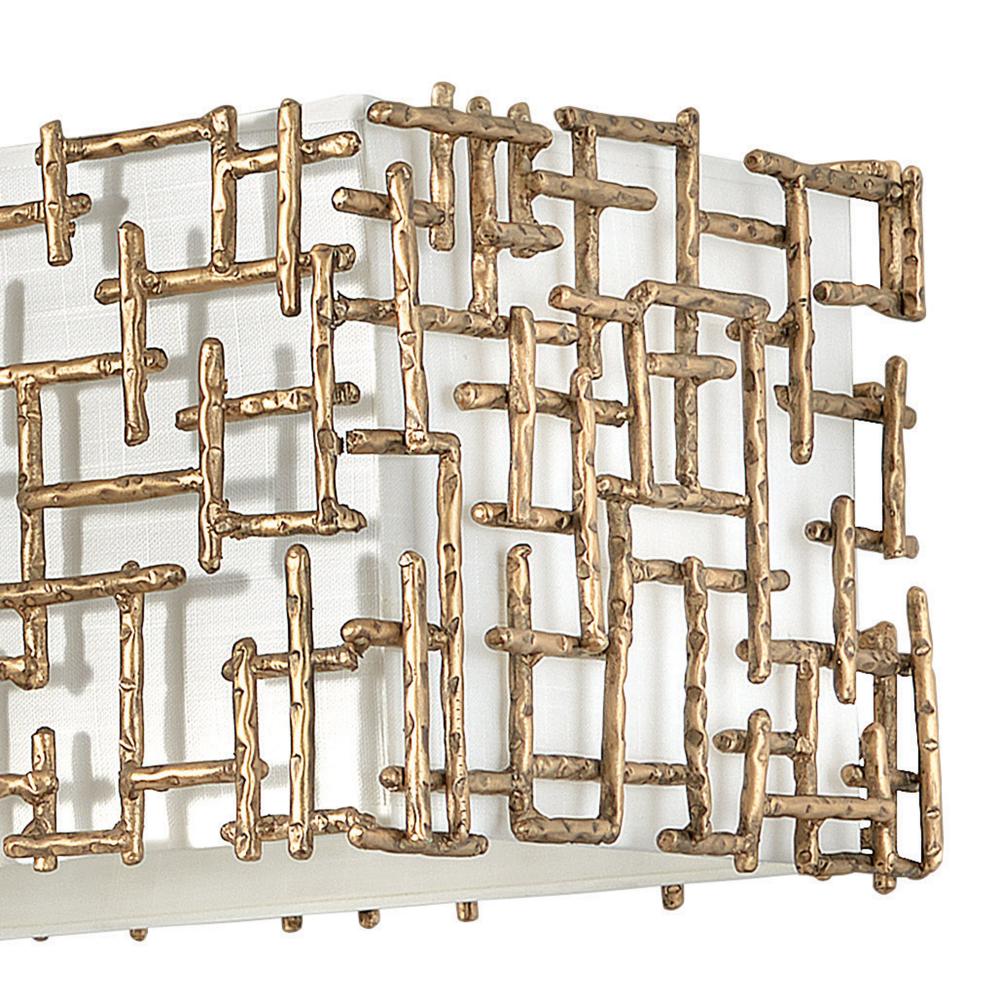 Farrah’s contemporary design is bold and sculptural, while achieving an optical airiness. The hand-hammered crosshatch bars gleam in a hand-applied Silver Leaf or Burnished Gold finish with artisanal detailing that carries through to the canopy detail. Set against a White Linen shade, Farrah creates a look of deconstructed; modern elegance.