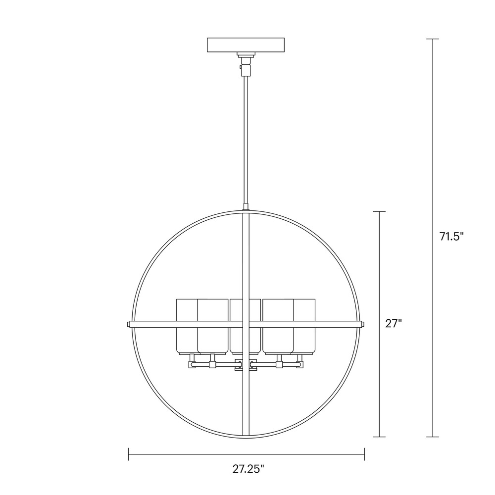 The Alturas five light single tier chandelier in brushed nickel supplies ample lighting for your daily needs, while adding a layer of today's style to your home's décor. The silhouette of the modern Alturas lighting collection by features an interlocking, spherical steel frame, which harkens back to the Unisphere constructed for the 1964 New York World's Fair. The minimalist Alturas Collection draws the eye to the soft, warm glow of the light emitted from the cylindrical Satin Etched glass shades. The full assortment includes three-, five- and nine-light chandeliers, a one-light mini pendant, a three-light pendant, a two-light semi flush which is convertible into a pendant, and one-, two-, three- and four-light bath fixtures. All fixtures are offered in Brushed Oil Rubbed Bronze, Brushed Nickel and Satin Bronze finishes, the bath fixtures are also offered in Chrome finish. Incandescent and ENERGY STAR-qualified LED lamping are available; all fixtures are California Title 24 compliant.
