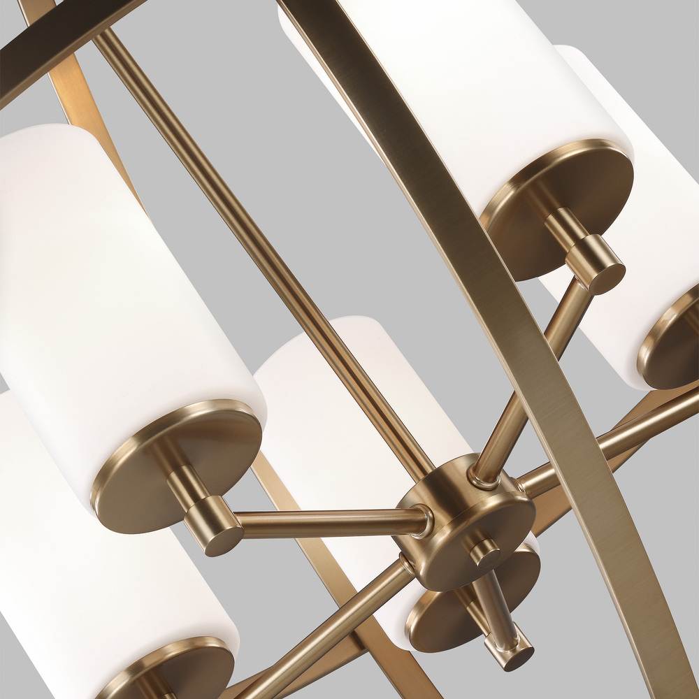 The Alturas five light single tier chandelier in satin brass is an ENERGY STAR® qualified lighting fixture that uses LED bulbs to save you both time and money. The silhouette of the modern Alturas lighting collection by features an interlocking, spherical steel frame, which harkens back to the Unisphere constructed for the 1964 New York World's Fair. The minimalist Alturas Collection draws the eye to the soft, warm glow of the light emitted from the cylindrical Satin Etched glass shades. The full assortment includes three-, five- and nine-light chandeliers, a one-light mini pendant, a three-light pendant, a two-light semi flush which is convertible into a pendant, and one-, two-, three- and four-light bath fixtures. All fixtures are offered in Brushed Oil Rubbed Bronze, Brushed Nickel and Satin Bronze finishes, the bath fixtures are also offered in Chrome finish. Incandescent and ENERGY STAR-qualified LED lamping are available; all fixtures are California Title 24 compliant.