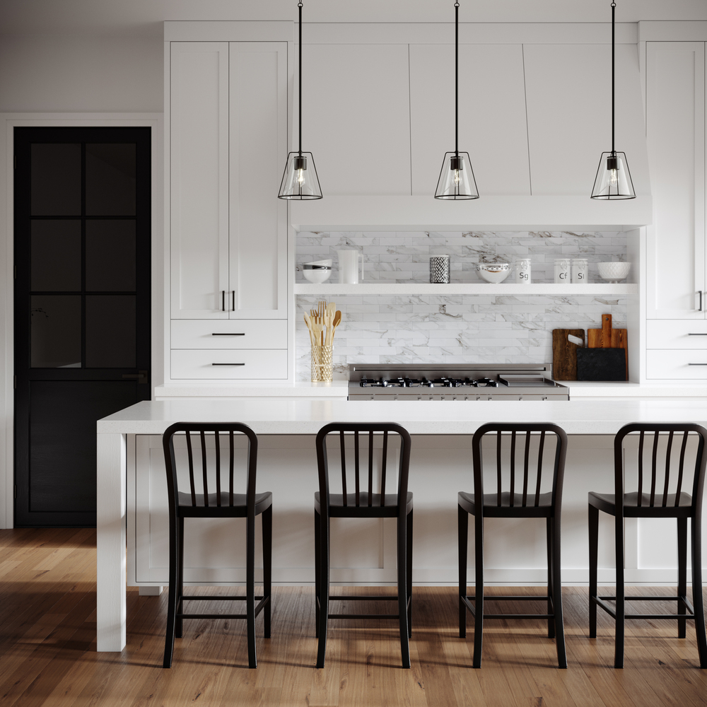 Modern, industrial fixture with traditional form will complement any dining room, kitchen, or foyer