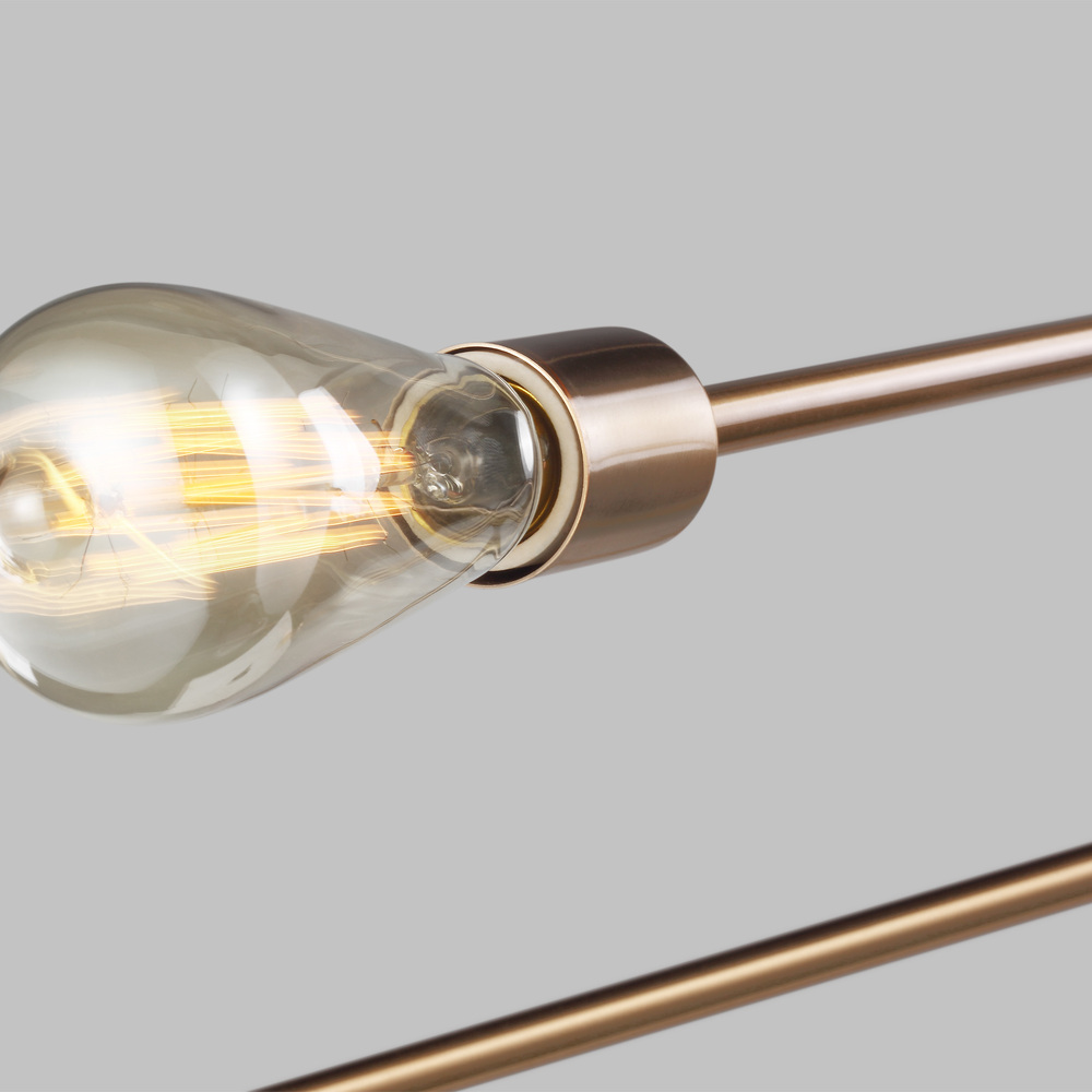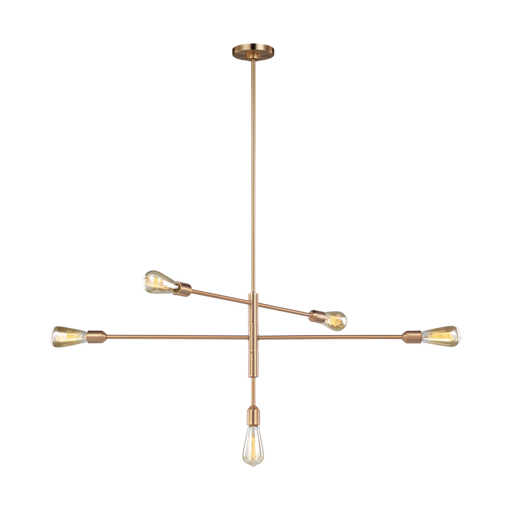 The Randolph five light chandelier in Satin Brass has a simple yet sophisticated design. The slender metal frame features midnight black or satin brass arms that are complete with an exposed bulb at each end. Create a stunning focal point over a dining table, kitchen island, in a living room or entryway with Randolph's exquisite design and directional lighting capabilities.