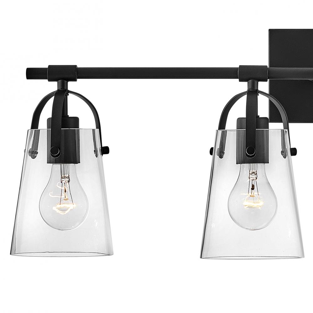 Clean and airy, Foster breathes composed simplicity into any bath space. Softly tapered glass shades suspended from arched handle prongs create a sophisticated transitional silhouette, enhanced by practical yet stylized details.
