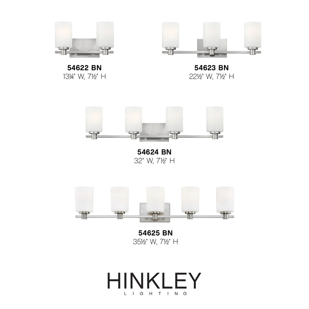 Karlie’s clean design is transitional in style and will complement a variety of décor. Featuring precision die-cast cups and cylindrical, etched opal glass, it is available in Brushed Nickel and Chrome.