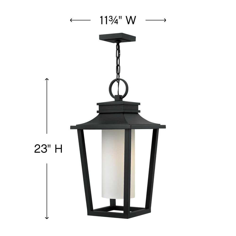 Sullivan’s clean transitional style features a minimalist cast aluminum body that frames the contemporary, candle-like etched opal glass. A large cast ring finial is mounted on top for a traditional finishing touch to this sleek lantern design.
