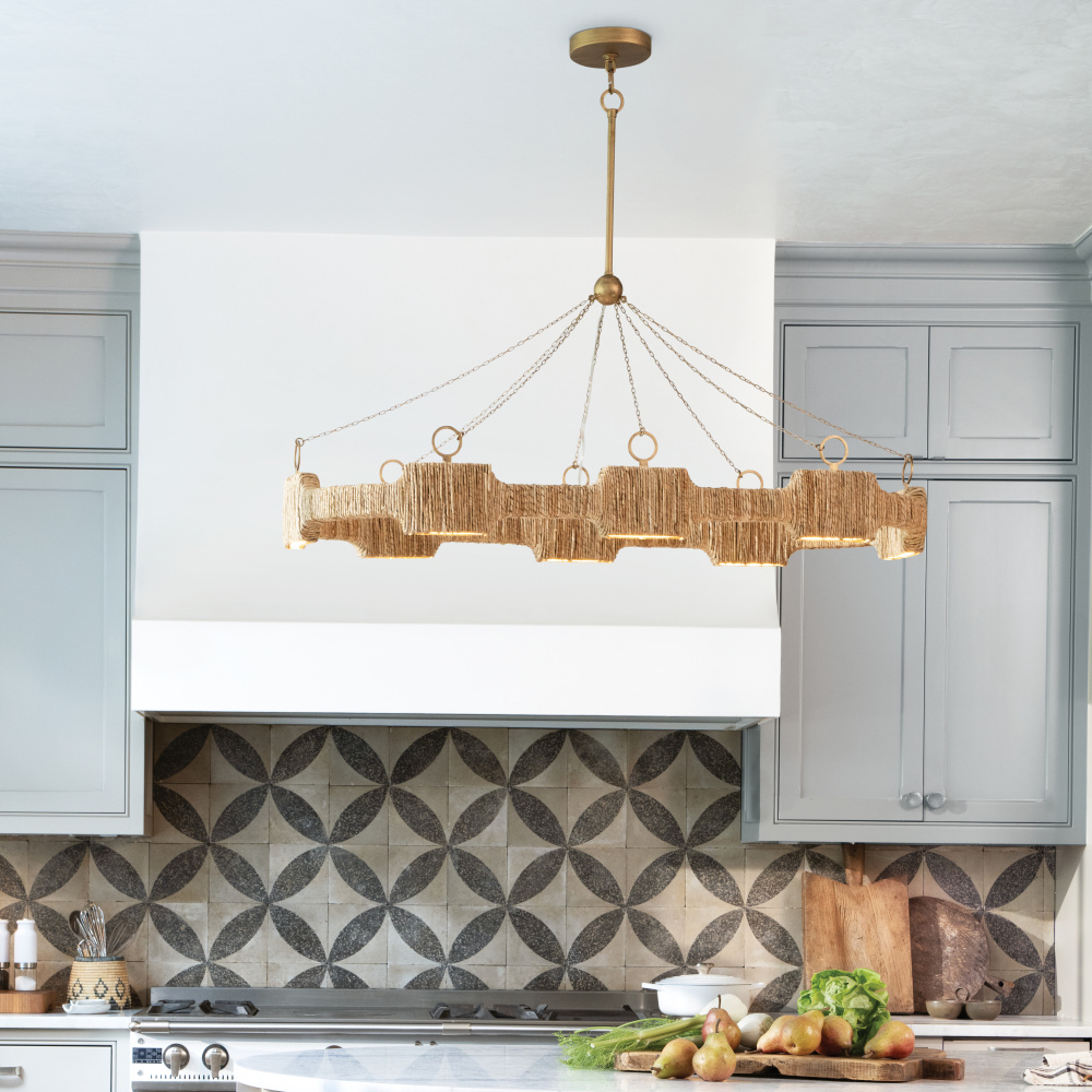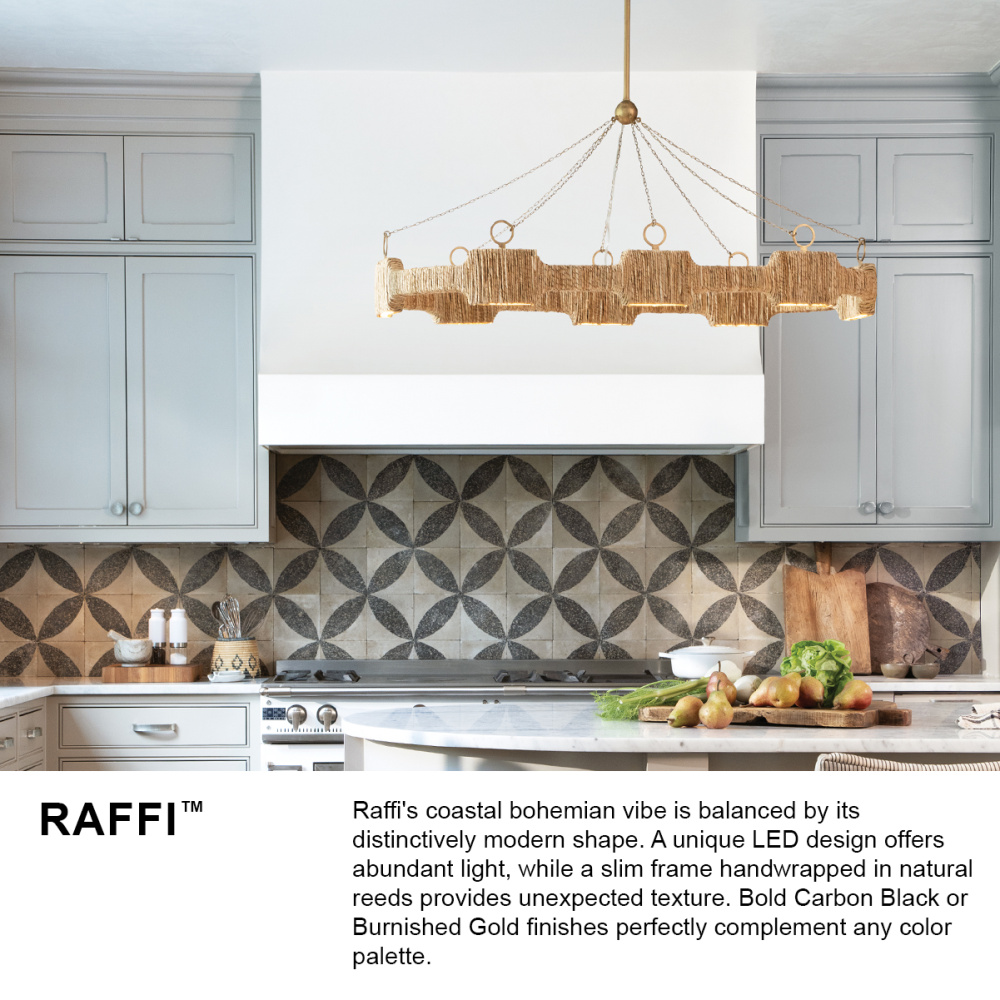 Raffi's coastal bohemian vibe is balanced by its distinctively modern shape. A unique LED design offers abundant light, while a slim frame hand-wrapped in natural reeds provides unexpected texture. Bold Carbon Black or Burnished Gold finishes perfectly complement any color palette.