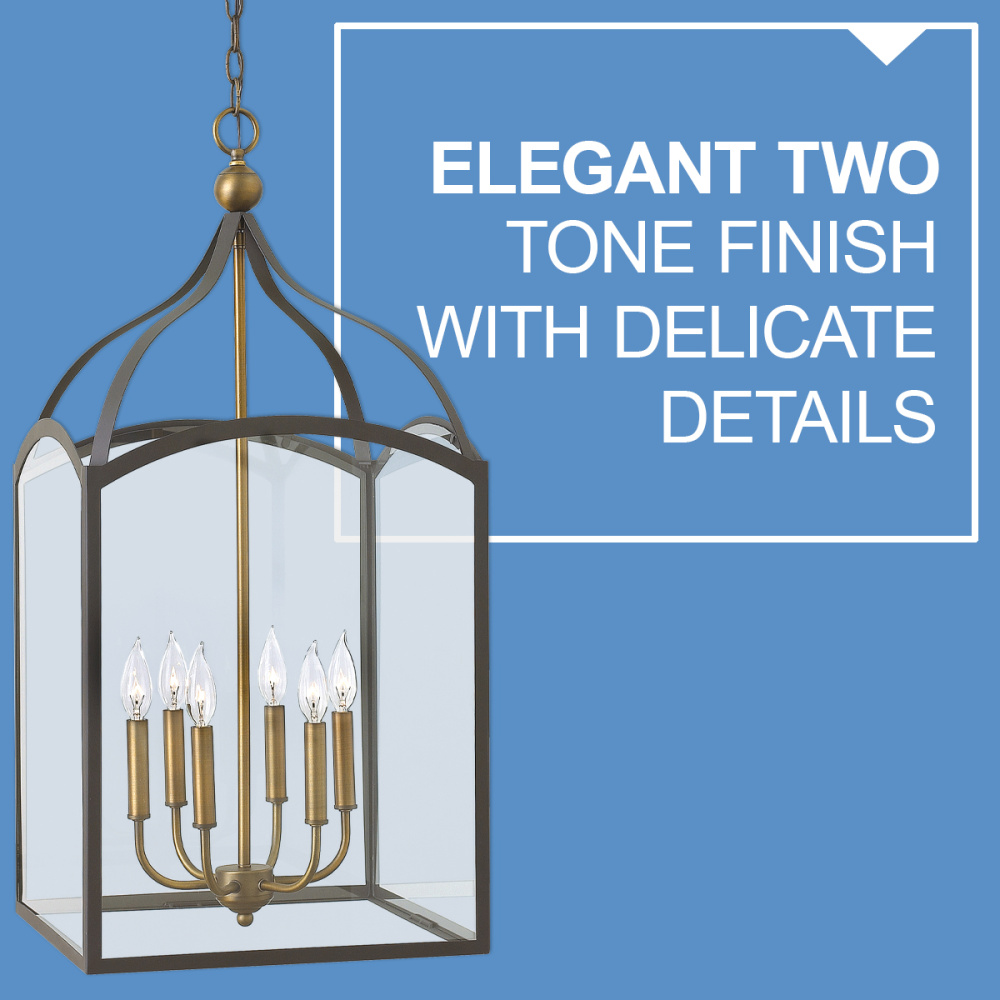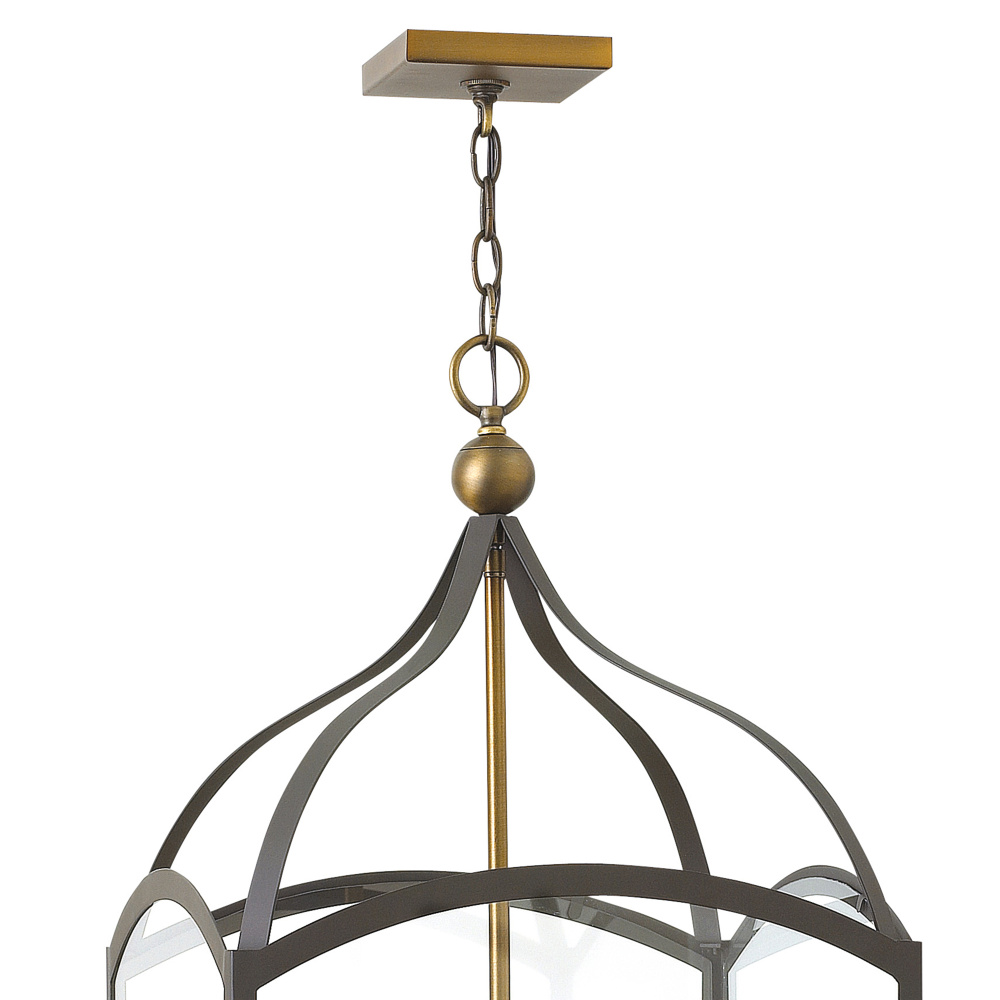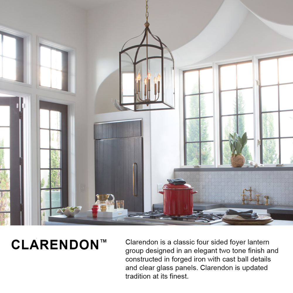 Clarendon is a classic four-sided foyer lantern group designed in an elegant two tone finish and constructed in forged iron with cast ball details and clear glass panels. Clarendon is updated tradition at its finest.